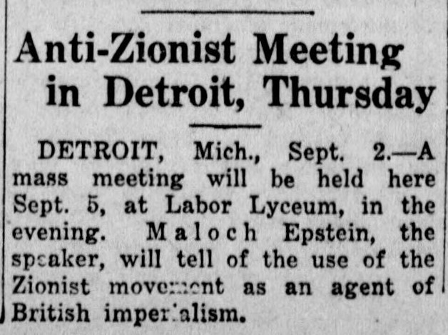 They were part of those who attended a mass meeting held at Cooper Union, arranged by the United Hebrew Trades. Towards the end of the meeting it was announced from the platform that a demonstration in favor of Zionism and British imperialism would be held in front of the two Communist newspapers, all those present being urged to participate.
