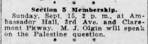 The speakers were William W. Weinstone, district organizer of the Communist Party; Morris Shifris, who was a member of the Jewish Legion which fought for British imperialism in Palestine; M. J. Olgin, editor Jewish Daily Freiheit; Louis Hyman, M. Epstein and J. Sultan. B. Saltzman presided.