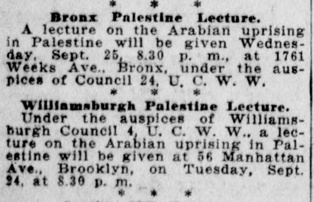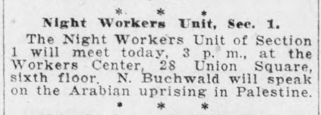 The secretaries and active members of the Jewish Workers Clubs of New York will hold a special meeting at 6:30 o’clock tonight at 108 East 14th St., when the question of events in Palestine and the provocative actions of the Jewish fascists will be taken up.