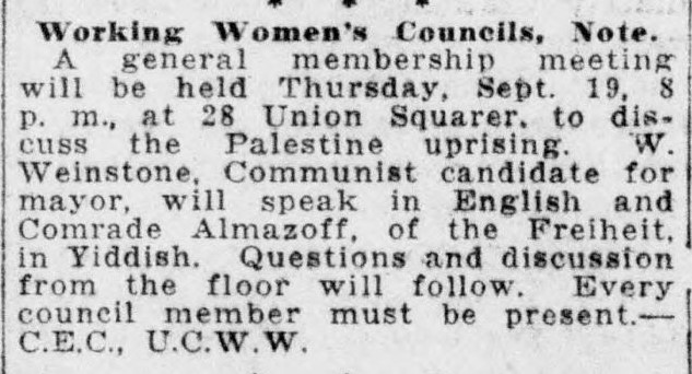 Although a group of Zionists and socialists following out the policy of provocative, editorials and news stories against the Communist Party for its revolutionary position on the Palestine question that appeared in yesterday’s editions of the Jewish Daily Forward and the Jewish Day, attempted to break up the meeting early in the evening, they were repulsed by the strong workers’ guard which assembled in the hall. The overwhelming majority of the Jewish workers present agreed with the speeches which they enthusiastically applauded.