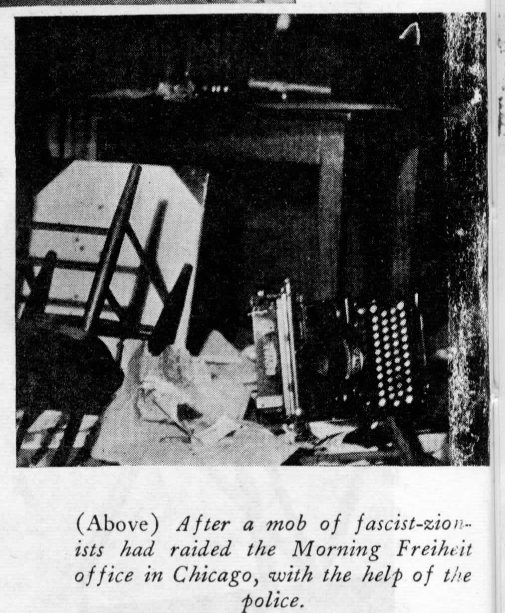 Workers Rush to Guard “Daily”and Jewish Morning Freiheit–Chicago Office Raided–Police Aid Zionists in Cleveland–Yellow Socialists Aid Jingoists, Fascisti–Lynch Threat by Zionists.