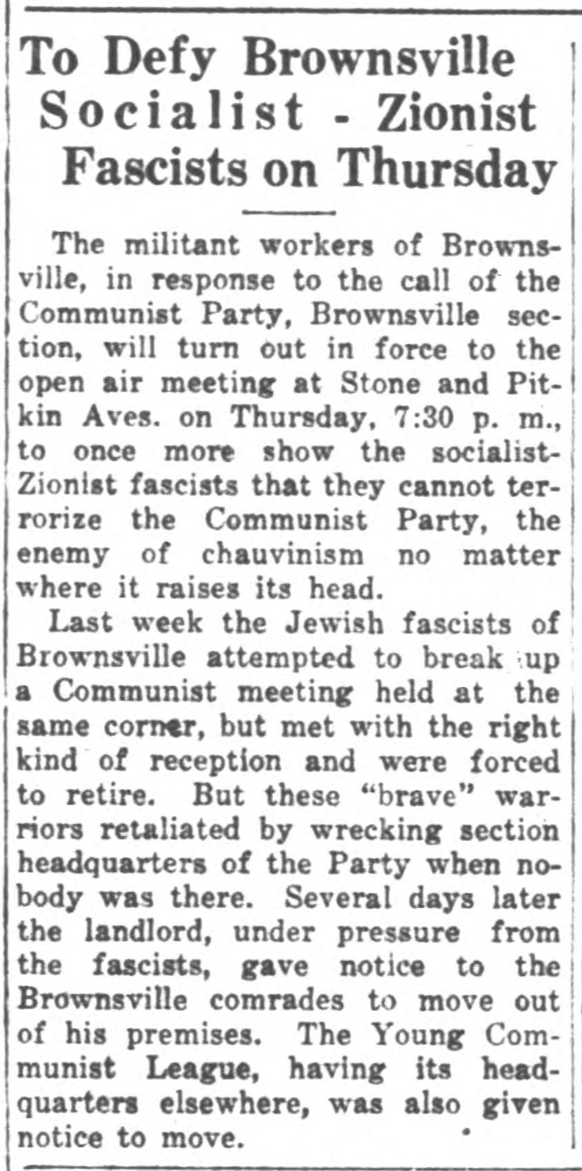 The Zionist-fascisti and yellow socialists then resorted to opening a meeting on the other side of thestreet, at 147th St. and Kinsman Ave. One of the Zionist speakers at this meeting was a certain Robins, notorious as an open shopper. Other Zionist speakers were socialists.