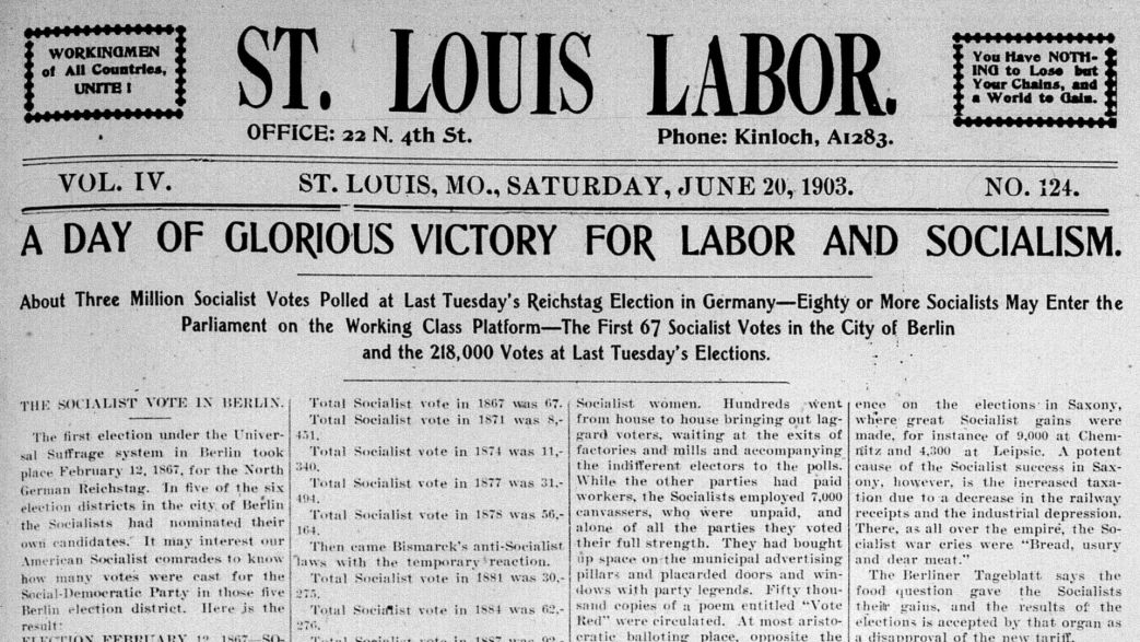 A long-running socialist paper begun in 1901 as the Missouri Socialist published by the Labor Publishing Company, this was the paper of the Social Democratic Party of St. Louis and the region’s labor movement. The paper became St. Louis Labor, and the official record of the St. Louis Socialist Party, then simply Labor, running until 1925. The SP in St. Louis was particularly strong, with the socialist and working class radical tradition in the city dating to before the Civil War. The paper holds a wealth of information on the St Louis workers movement, particularly its German working class.