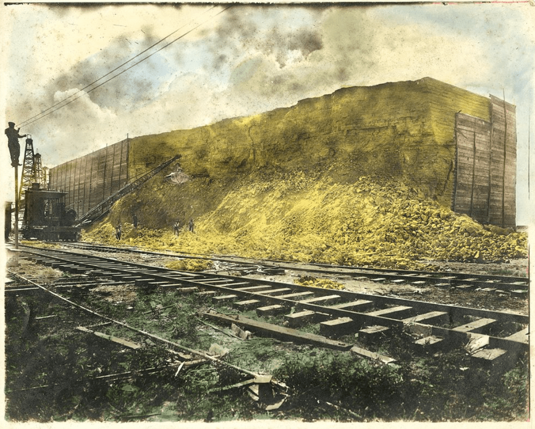 Up till the later nineties Sicily led the world in sulphur production. The Sicilian method was delightfully simple and painfully wasteful. They just piled the ore in pits and set fire to it and what didn’t burn ran to the bottom and was saved.