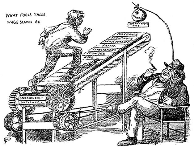 You know that the worker must eat? That he must wear clothing? That he must have some place to live in? Yes, we all know the three essential things to live, food, clothing, and shelter. Can the worker, individually, produce these for himself? No, because machinery and large scale production has driven the mass of the people to work for wages; that is, to use the machinery belonging to the boss, or work in the boss’s organization of the job, and in return get a certain amount of money to buy necessities.