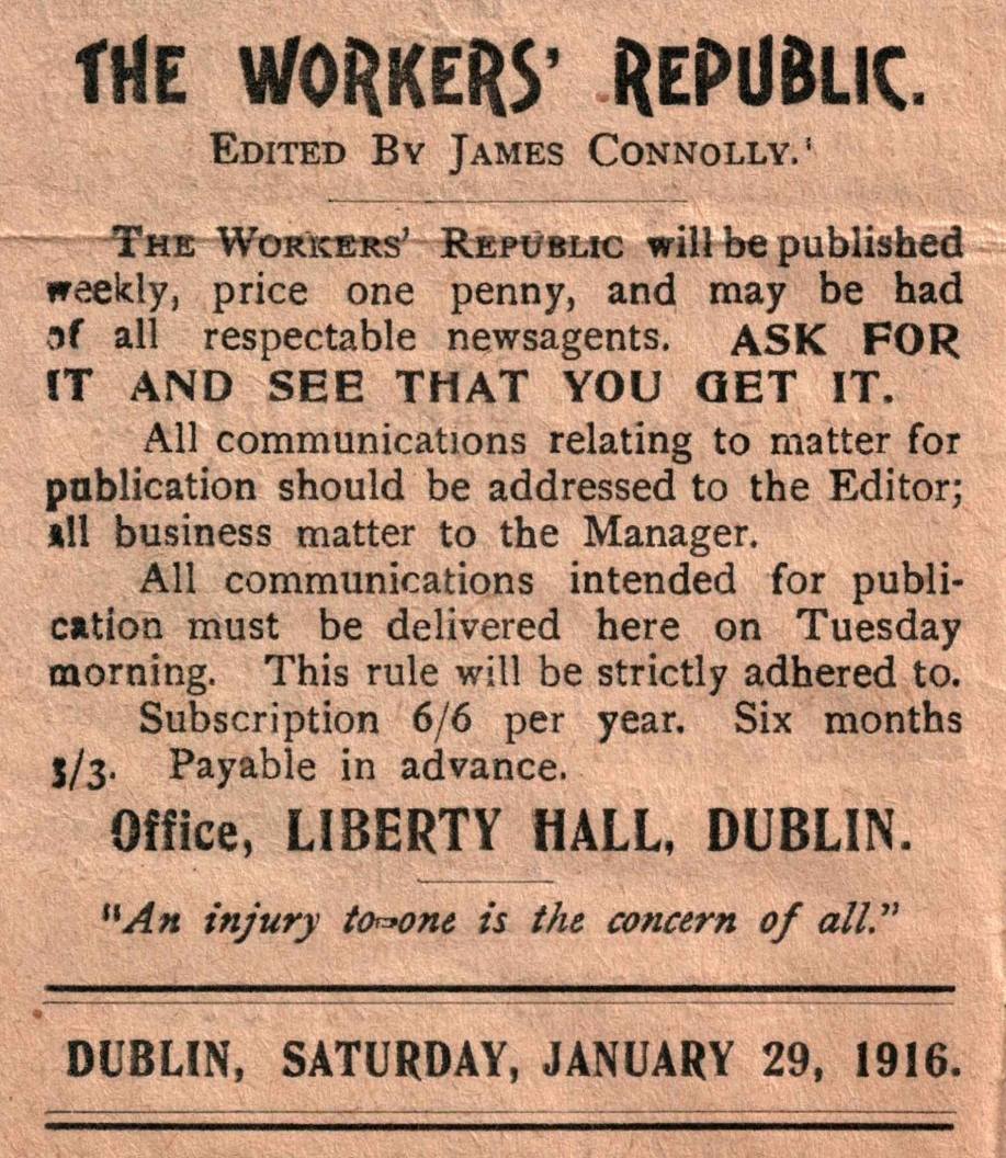 “Irish toilers from henceforward will base their fight for freedom not upon the winning or losing the right to talk in an Irish Parliament, but upon their progress towards the mastery of those factories, workshops and farms upon which the people’s bread and liberties depend.”