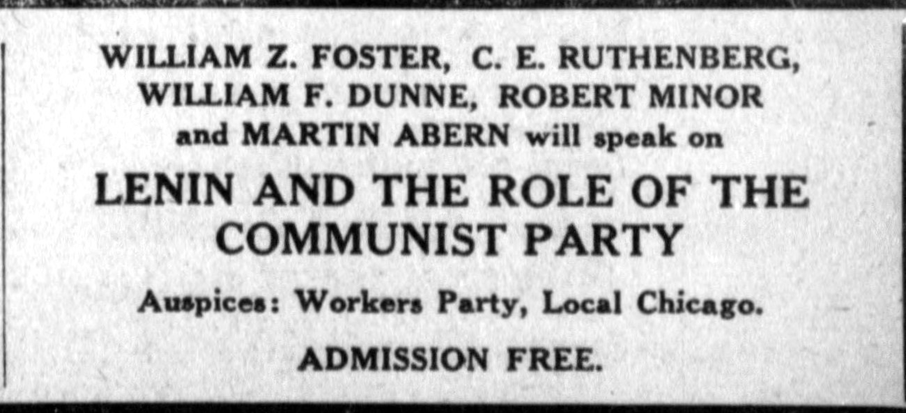 Martin Abern, then Secretary of the Chicago Communist Party, on a recent meeting of the Local’s Central Committee and work in the city during the fall of 1924.