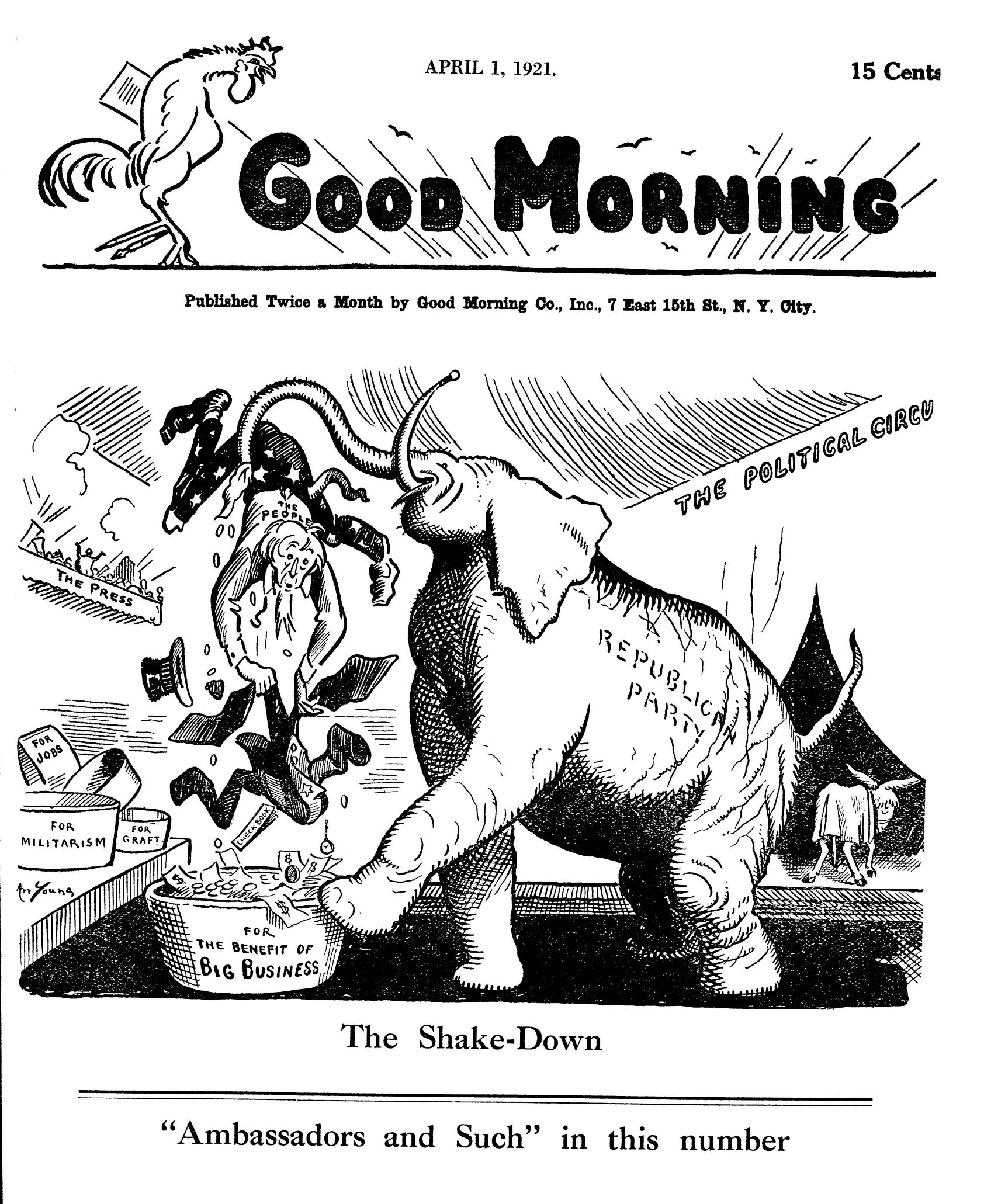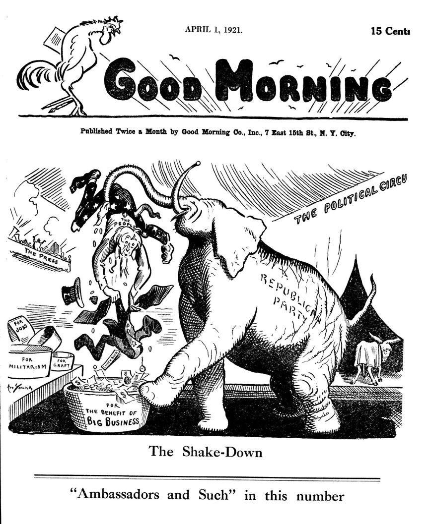 Good Morning was a (wonderful) left-wing illustrated humor magazine published bi-weekly from May 1919 until October 1921 by Ellis O. Jones and legendary radical cartoonist Art Young. Both had worked together earlier on The Masses. Good Morning was funded by donations and was forced to decrease in frequency from weekly to semi-monthly to monthly with a press run between 4 and 10 thousand, finally folding in late 1921.