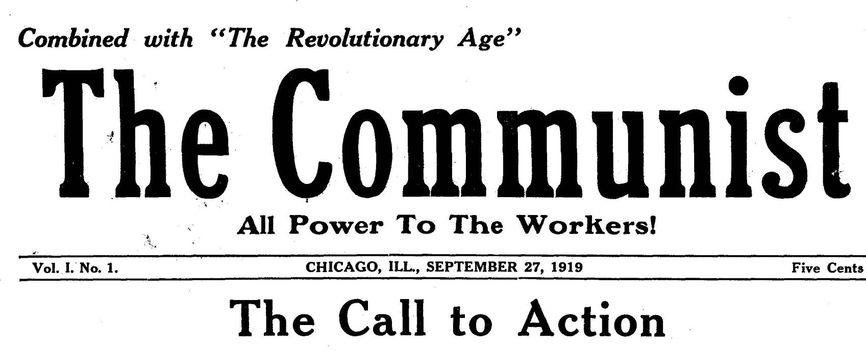 Emulating the Bolsheviks who changed the name of their party in 1918 to the Communist Party, there were up to a dozen papers in the US named ‘The Communist’ in the splintered landscape of the US Left as it responded to World War One and the Russian Revolution. This ‘The Communist’ began in September 1919 combining Louis Fraina’s New York-based ‘Revolutionary Age’ with the Detroit-Chicago based ‘The Communist’ edited by future Proletarian Party leader Dennis Batt. The new ‘The Communist’ became the official organ of the first Communist Party of America with Louis Fraina placed as editor. The publication was forced underground in the post-War reaction and its editorial offices moved from Chicago to New York City. In May, 1920 CE Ruthenberg became editor before splitting briefly to edit his own ‘The Communist’. This ‘The Communist’ ended in the spring of 1921 at the time of the formation of a new unified CPA and a new ‘The Communist’, again with Ruthenberg as editor.