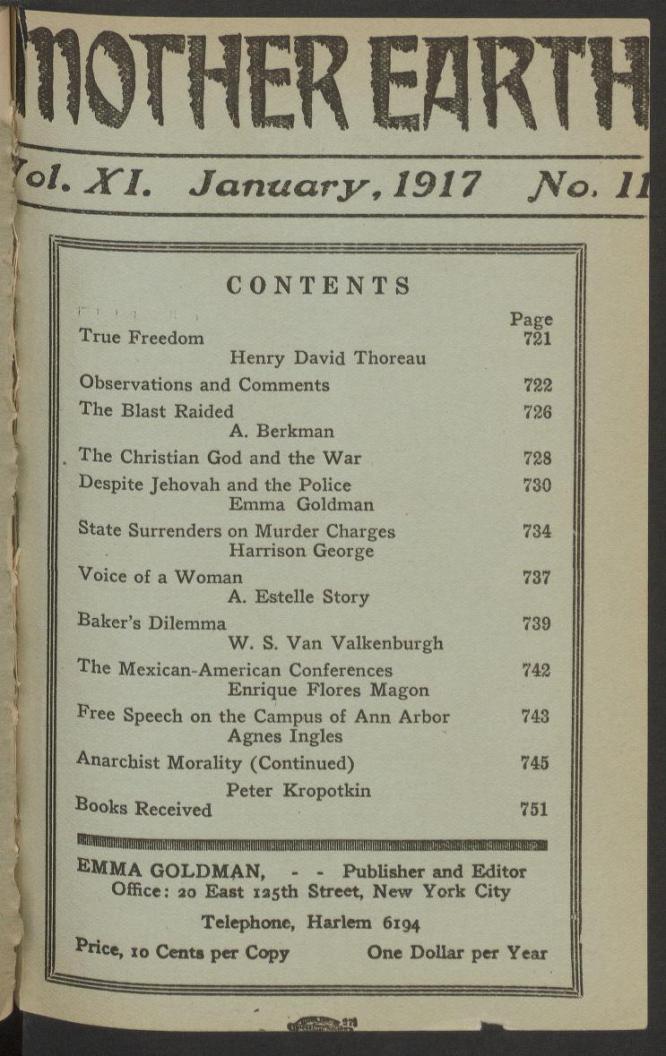 Contents: True Freedom by Henry David Thoreau, Observations and Comments, The Blast Raided by A. Berkman, The Christian God and the War, Despite Jehovah and the Police by Emma Goldman, State Surrenders on Murder Charges by Harrison George, Voice of a Woman by A. Estelle Story, Baker’s Dilemma by W. S. Van Valkenburgh, The Mexican-American Conferences by Enrique Flores Magon, Free Speech on the Campus of Ann Arbor by Agnes Ingles, Anarchist Morality (Continued) by Peter Kropotkin, Books Received.