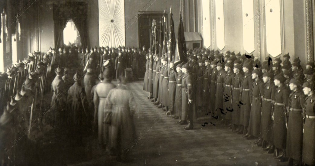 On February 18 the Germans unexpectedly resume their advance and occupy Dvinsk; early in March they take Pskov and advance rapidly on Petersburg. The troops at the front flee without offering the least resistance. The Red Guard of the Petersburg proletariat in a single night calls into life whole regiments of workers. In the Smolny Institute a general staff is created. Twenty-four hours later armed trains and artillery proceed to the front, and after two days more the first cavalry division sets forth. “The Socialist fatherland is in danger,” Comrade Lenin announces in his proclamation. Red Petersburg receives its baptism of fire and forces the German advance to halt. An armistice is called, which leads to the peace of Brest-Litovsk. The entire situation of the Republic indicated the urgent necessity of creating a regular Red Army. The principle of universal military service was not in accord, however, with the attitude of the masses for the moment; as a provisional measure the principle of voluntary military service is applied and the local soviets display the greatest initiative. After this question has been elaborated in the All Russian Collegium for Organizing a Red Army, and after the fundamental points of the decree have been approved by the Soldiers’ Sections of the Third Congress of Soviets, the Council of People’s Commissars issued the Decree on the Organization of the Red Army, the army of the workers and peasants.