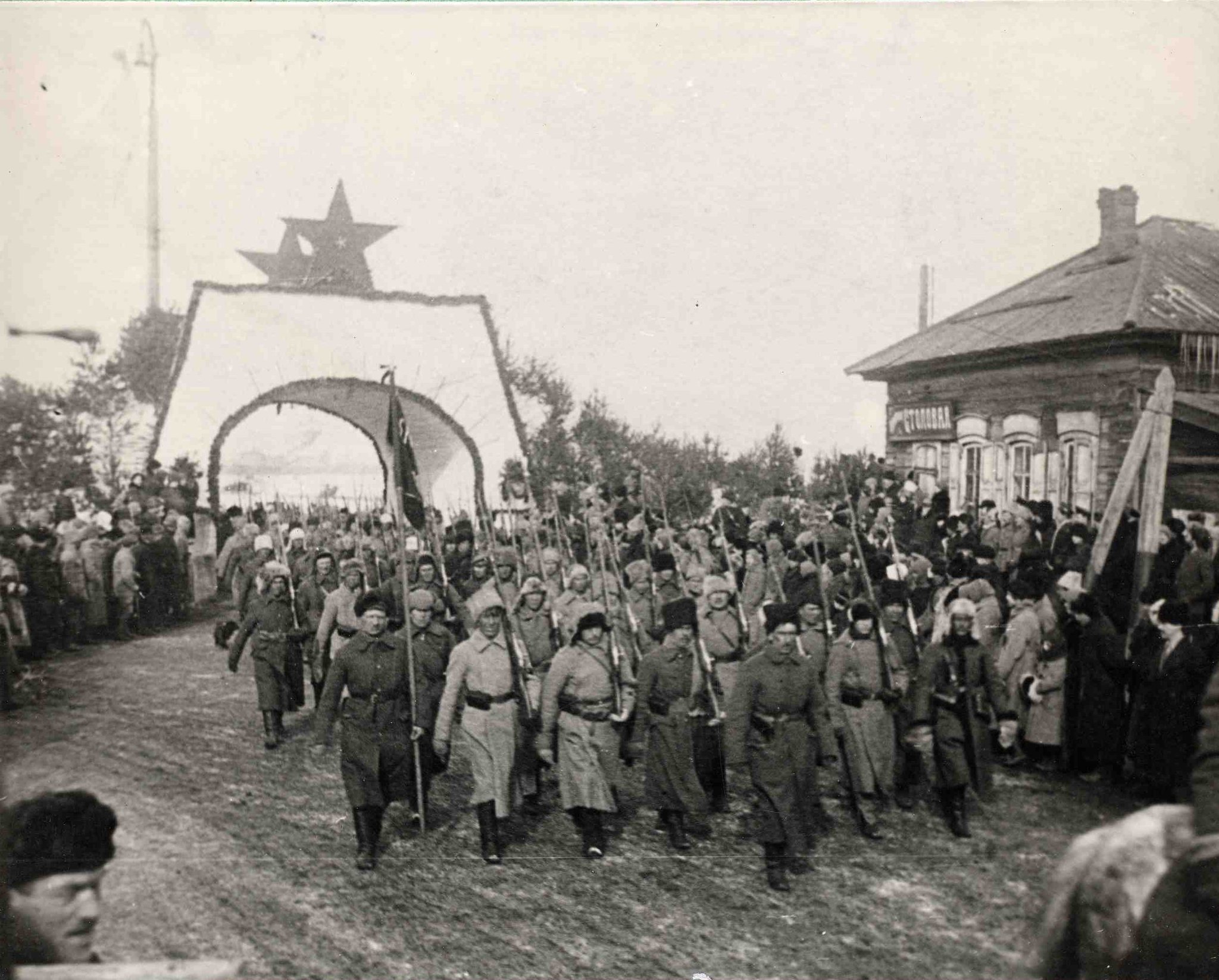 The Czecho-Slovak army, consisting of 30,000 men and eight batteries of three-inch guns, armored trains, and an air squadron, was to be transported to the French front by way of Vladivostok. The causes of the Czecho-Slovak insurrection were suf-activity [sic] of the French and English Governments in supporting this army, particularly its officers, is not open to dispute. On May 29 the Czecho-Slovaks took Penza; reinforced by all the counterrevolutionary forces of the Urals and Siberia, they then occupy Samara, Simbirsk, Ufa, and Yekaterinburg; thereafter their advance on Moscow begins. On July 28 they take Kazan, where our gold supply and great powder stores fall into their hands. At about the same time, Anglo-American detachments seize Murman and the White Sea region and send their flotillas up the Dvina. A number of insurrections in our rear, and the attempt of the Left Social-Revolutionaries, displeased by the Brest peace, to seize power in Moscow as well as Muraviev’s adventure at the front, put the republic in an extremely grave position. Connections between the front and rear were proven in this period to be quite firm. The country was transformed into a military camp. Conscriptions of workers are made in Moscow and Petrograd and later in the provinces, masses of non-commissioned officers and former officers formed the necessary kernel of the army; the mobilization of all party forces raised the morale of the Red Army men; the army loses the last vestiges of its improvised character and under the leadership of General Tukhachevsky (commander of the First Army), the first Red divisions march eastward. The recovery of the Volga and the Urals from the Whites was quickly accomplished, and on January 22, 1919 our troops united after the fall of Orenburg with the troops of Red Turkestan.