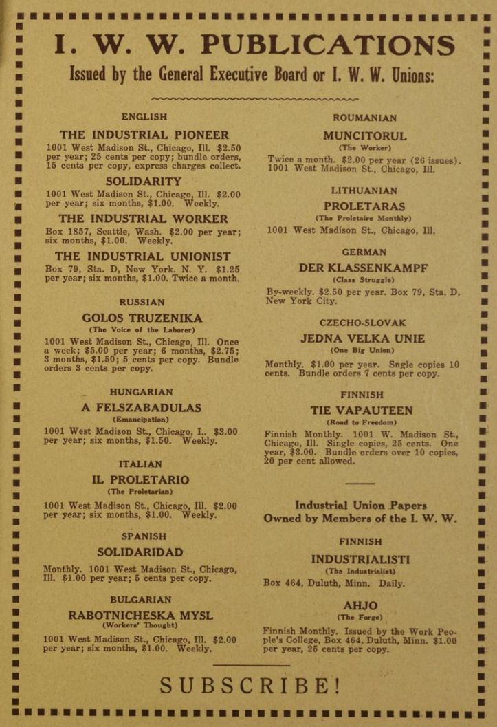 The Industrial Pioneer was published monthly by Industrial Workers of the World’s General Executive Board in Chicago from 1921 to 1926 taking over from One Big Union Monthly when its editor, John Sandgren, was replaced for his anti-Communism, alienating the non-Communist majority of IWW. The Industrial Pioneer declined after the 1924 split in the IWW, in part over centralization and adherence to the Red International of Labour Unions (RILU) and ceased in 1926.