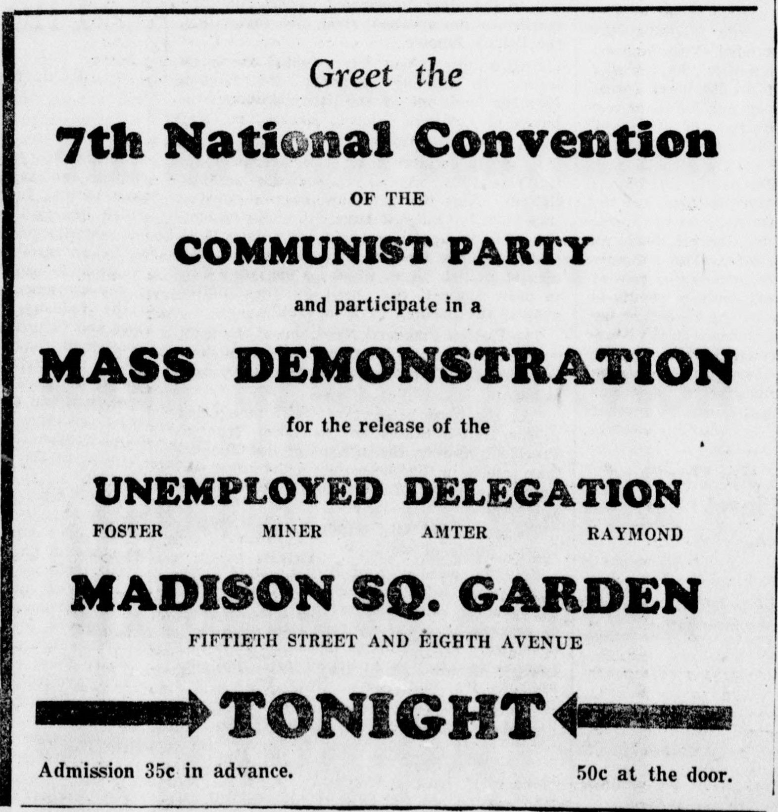 1930 was a low ebb for the Communist Party. Since its last National Convention in 1928 it went through two damaging splits, losing thousands of cadre and much of its historic leadership, being reduced to around 6,800 members in the process. At the Communist International went through parallel splits and made a sharp political pivot to the ‘Third Period’ of crisis and confrontation, including the building of new unions. The Great Depression had begun the previous October with unemployment becoming the central issue. It was in those circumstances that, for the first time since its founding, the party did not face an organized factional dispute at a National Convention.