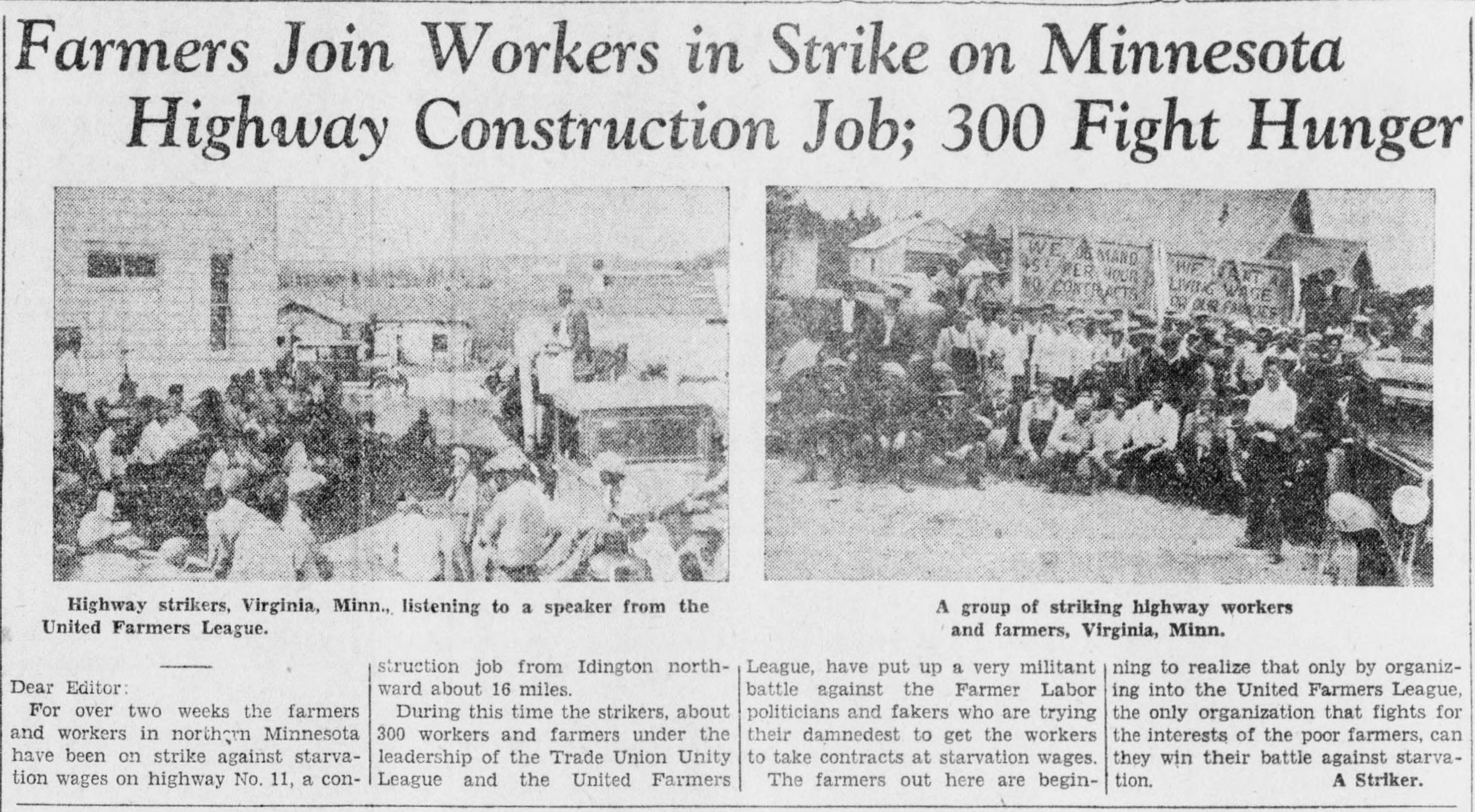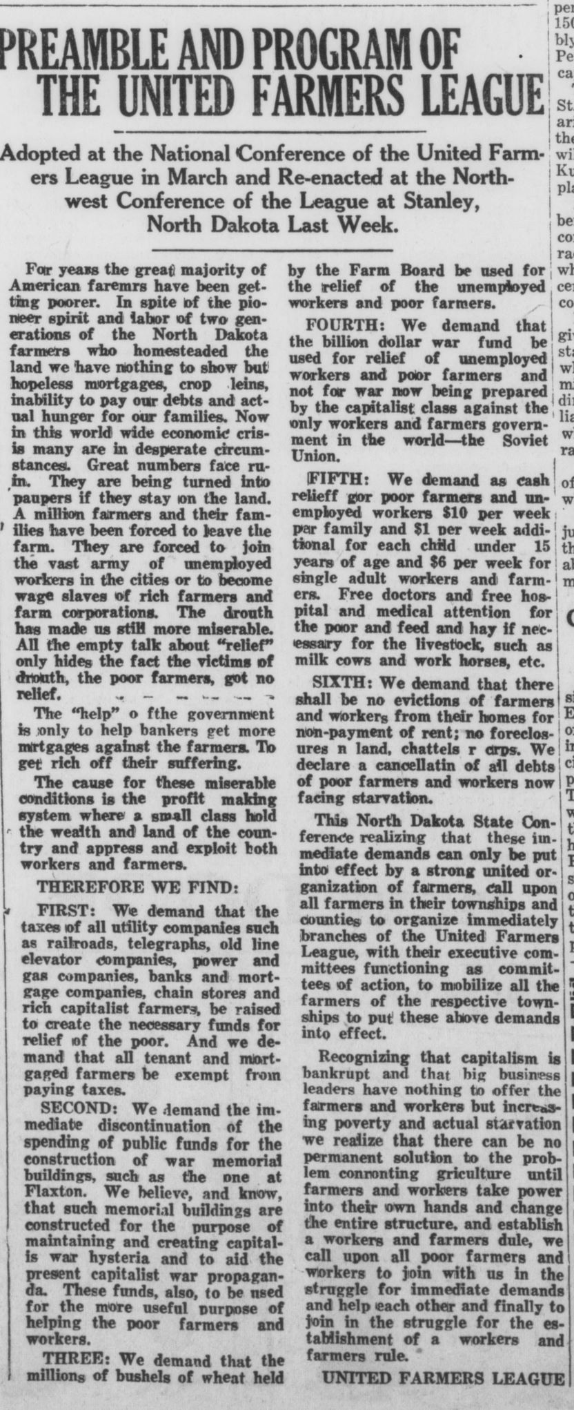 (5) Development of local demands. Besides circulating the paper, one of the purposes of the Sunday visits of our comrades to the countryside must be to study conditions and grievances of the farmers and find out on what points they are ready for immediate action and struggle. On this basis local demands must be formulated and farmers organized into action under the leadership of the United Farmers League township committees, Tenant Farmers Action Committees, and the like. In the process of these activities the United Farmers League can be built upon a mass basis.