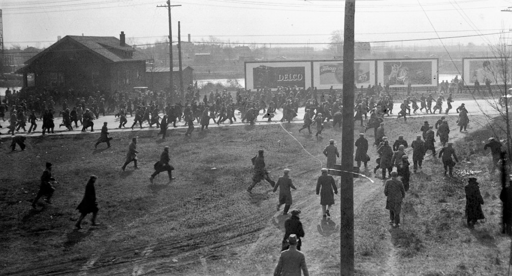 In an orderly manner we started towards the Ford Factory to ask for bread. There was no violence whatever. At the beginning a leading comrade warned us, “Remember no trouble, we want to ask for bread in a peaceful manner.” There we were met by the Dearborn uniformed thugs-40 of them. They at once shot tear gas pistols at the workers. With eyes covered, the crowd wavered a moment, and someone shouted, ”Let’s go! Let’s give it to them!” Then they started throwing stones and fought so fiercely that the 40 Dearborn police had to retreat-and how they ran!