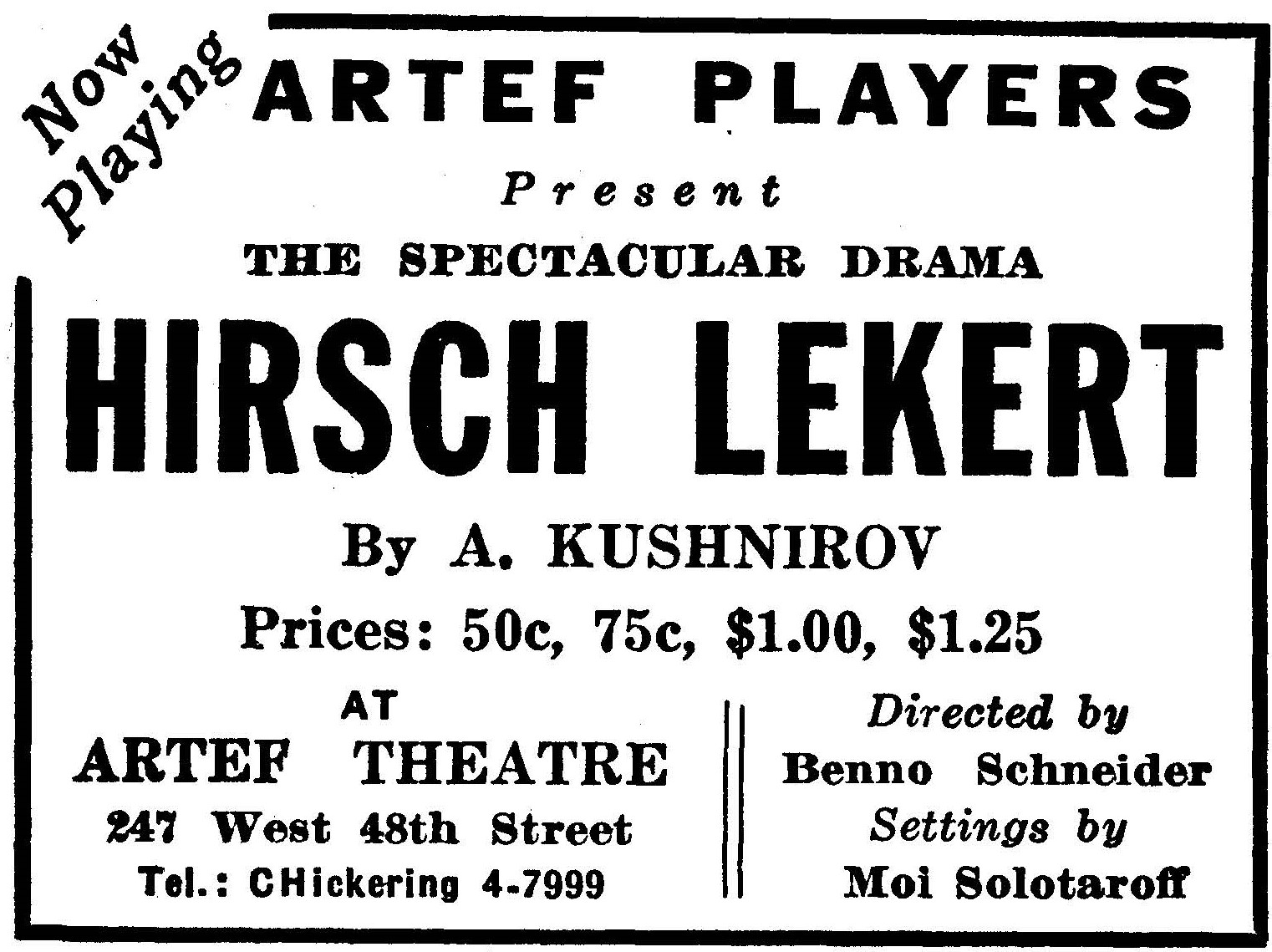 In 1932, on the occasion of the thirtieth anniversary of the execution of the revered proletarian martyr, the Artef Theater produced the Kushnirov play, which has now been revived and enriched both in direction and performance. In its current version, Hirsch Lekert is easily the best production of the Artef, Recruits notwithstanding.