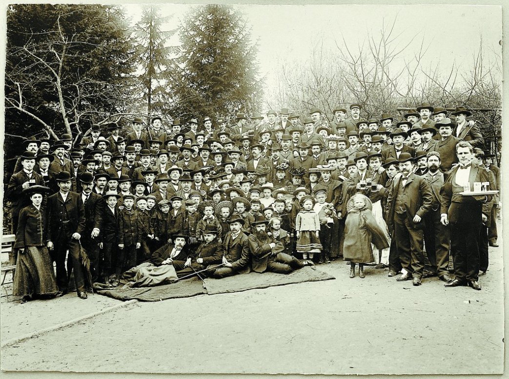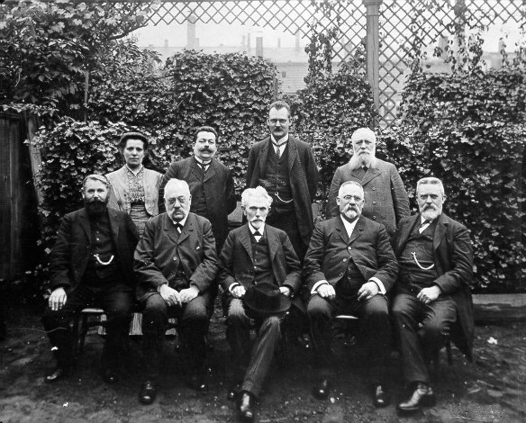 below (from left to right): Alwin Gerisch, Paul Singer, August Bebel, Wilhelm Pfannkuch, Hermann Molkenbuhr, 1909.
