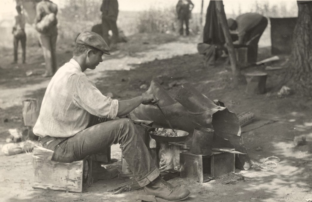 This is the way that most of the harvest hands exist. What a reward for the reapers of the golden harvest-meager food, cooked and eaten out of tin cans; sleeping in filthy box cars, wearing dirty and ragged clothes, denied most of the necessities and all of the comforts and luxuries of life, denied the company of women, denied life itself.