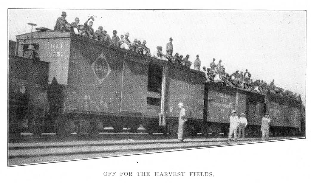 Every year the railroad, steamship companies, labor bureaus, commercial clubs and newspapers send out wonderful stories of the bountiful crops to be harvested in the western parts of the United States and Canada. These notices read: “THOUSANDS OF MEN WANTED-PLEASANT HOMES BIG WAGES.”