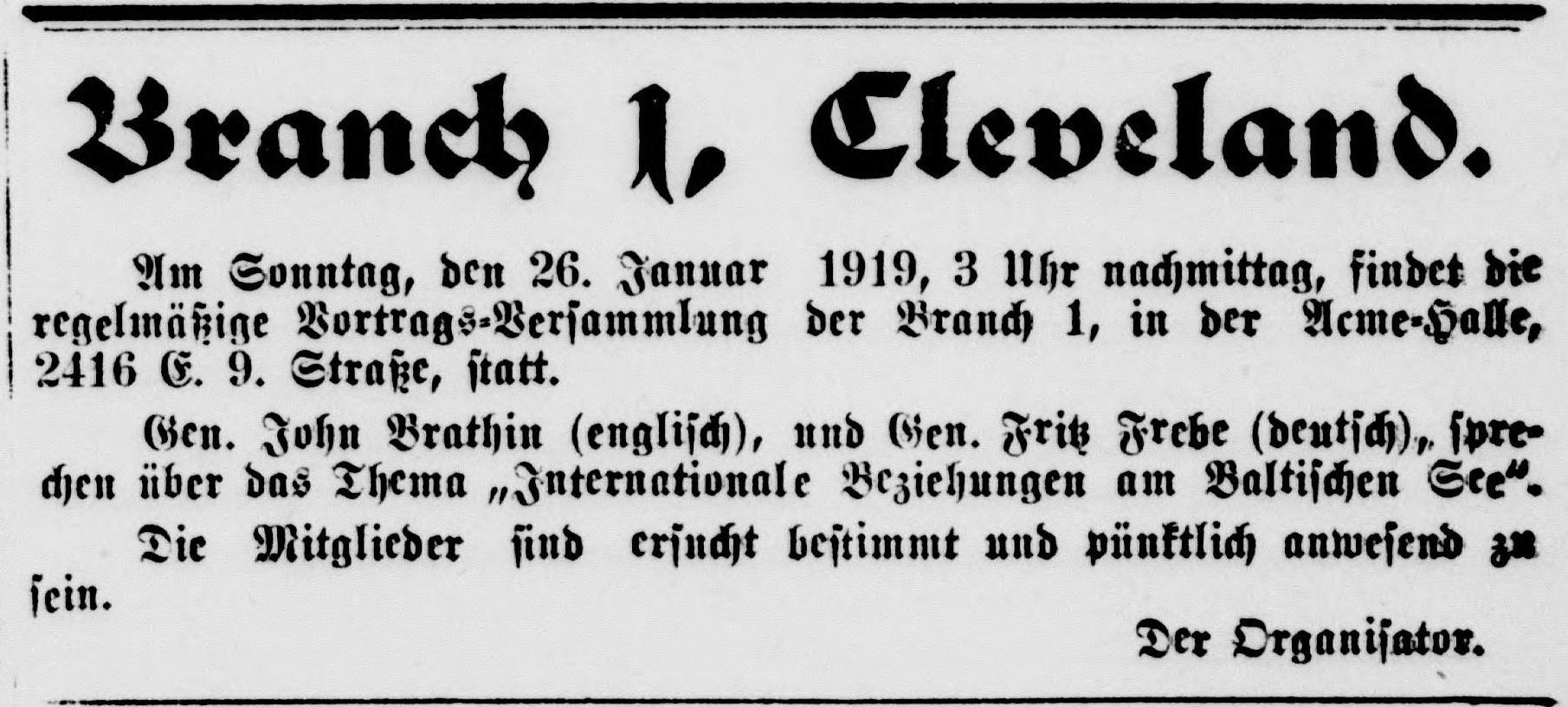 Cleveland, Ohio had one of the largest, most militant and will organized Socialist Party locals of any city in the country. The home of Charles Emil Ruthenberg, Cleveland hosted the most left-wing German-American community in the country. Karl Liebknecht spoke there on his 1910 tour of the country and here that community gathers to honor him a month after his murder. By the end of the year Ruthenberg would be a leader of the Communist Party and the ‘Ohio Socialist’ would become the paper of the rival Communist Labor Party.