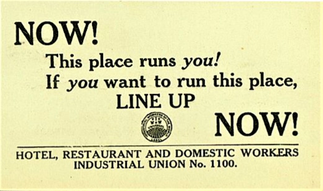 ‘Conditions in the Restaurant Industry’ by Charles Mundell from One Big Union Monthly. Vol. 1 No. 8. October, 1918.