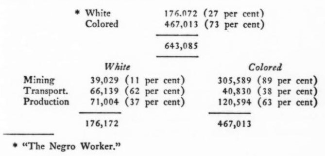 2. The overcrowding of the “reserves” has compelled the natives to seek employment in the industrial centers, particularly in the gold and diamond mines. Thus, there has developed a Negro industrial proletariat which constitutes the minority of the working class population. The following figures will give us an idea of the composition of the working class in South Africa: