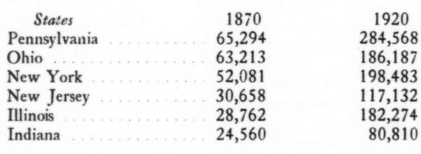 Soon after the Civil War, a slow but steady migration of Negroes from the South to the North began. Thousands of Negro peasants abandoned the plantations for the Northern cities. demand for labor in the war industries and the check on foreign immigration provided the basis for a huge mass movement from the South to the North, involving hundreds of thousands of Negroes. The Negro population of the North increased tremendously. The following table will show a partial picture of the increase of the Negro population in some of the industrial states: