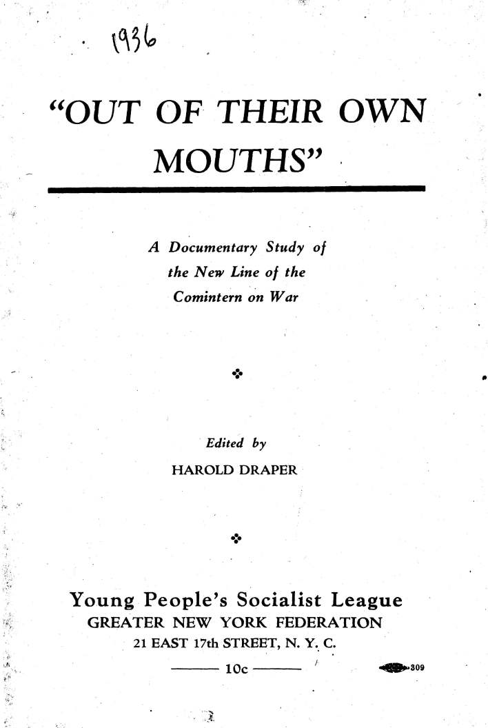 ‘Out Of Their Mouths: A Documentary Study of the New Line of the Comintern on War’ by Harold Draper. Published by the Y.P.S.L., Greater New York Federation. September, 1936.