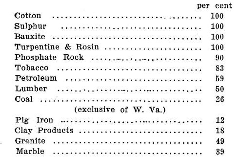 The South is fat with raw materials for manufacture. Everyone must recognize the importance of the primary products listed below. Annual southern output is here given in percentages of national production:
