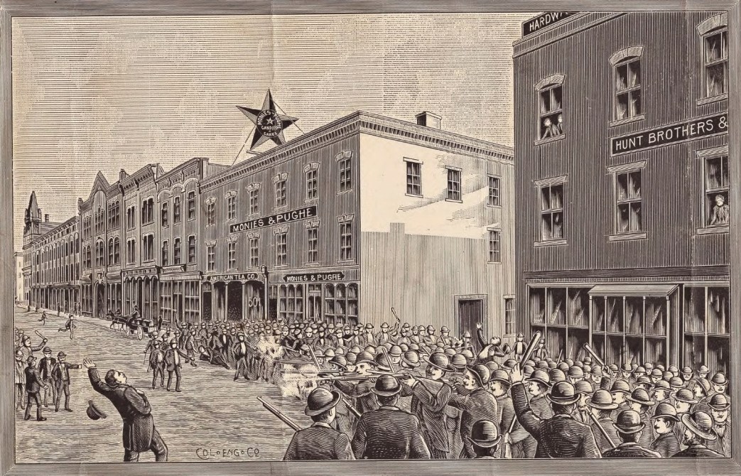One of the strangest features of the strike, and the one of which least is known, is the mysterious St. Louis “Soviet,” set up under socialist-leadership. This “Soviet” sent out committees which closed up every shop and mill in the place, and for a week seems to have taken over most of the functions of government in the city. In their proclamations the executive committee spoke of themselves as “the authorized representatives of the industrial population of St. Louis.” Orders were issued providing for food distribution, medical attendance, etc. How representative the committee really was and what its composition was will be worth finding out some day. At any rate, the bourgeoisie of the city were panic-stricken at its appearance-the spectre of the Paris Commune, then only seven years past, continually haunted the ruling classes of that period as the spectre of the Russian revolution does the ruling class of today.