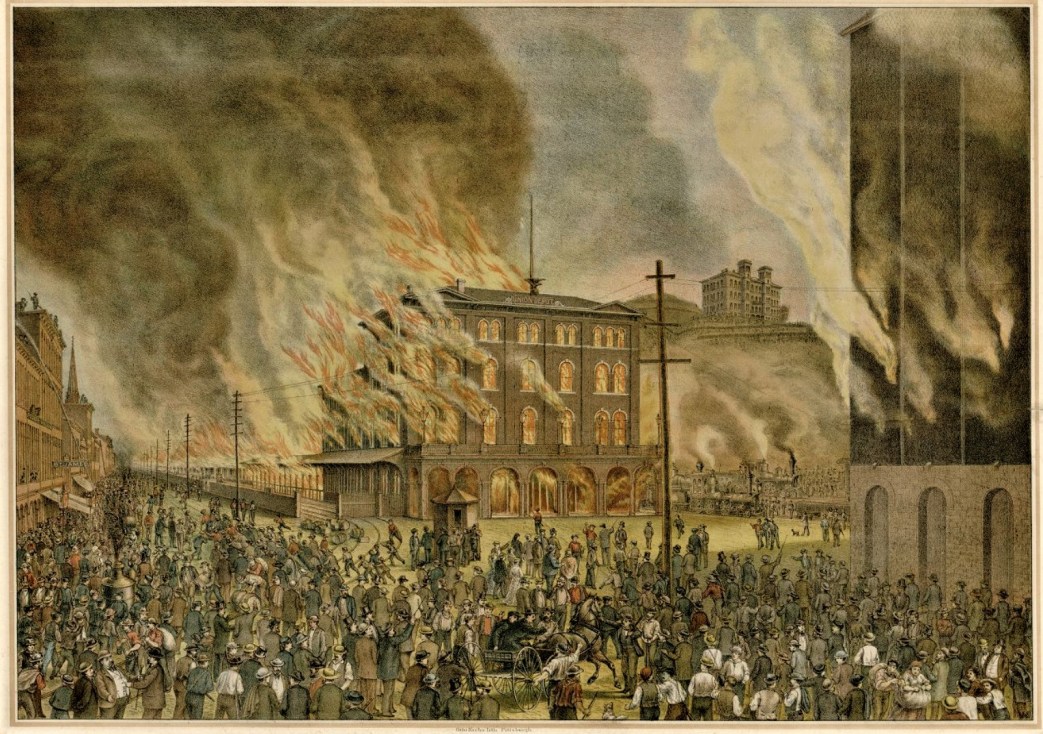 The Philadelphia troops had retreated to the railway roundhouse, and all night long the strikers tried to storm their refuge with two pieces of artillery captured earlier in the evening. Finally succeeding in making a breach in the walls, they tried to rush the building, but were forced back by the terrible concentrated fire of the troops within. Next the besiegers sent lighted cars of oil-soaked coke along the track toward the roundhouse, and soon it was in flames. The troops managed to escape from it under cover of a heavy artillery barrage, and after a fierce battle all along the line of retreat finally crossed the Allegheny River, never stopping till they reached Claremont, 12 miles beyond the city limits, where the strikers had vowed to drive them. The workers, who had suffered heavy losses, were now pretty well exhausted, and a vigilance committee that was formed at last managed to arrest the strike leaders. Two roundhouses and all the railroad shops had been destroyed, as well as some 1,600 cars and 125 locomotives.