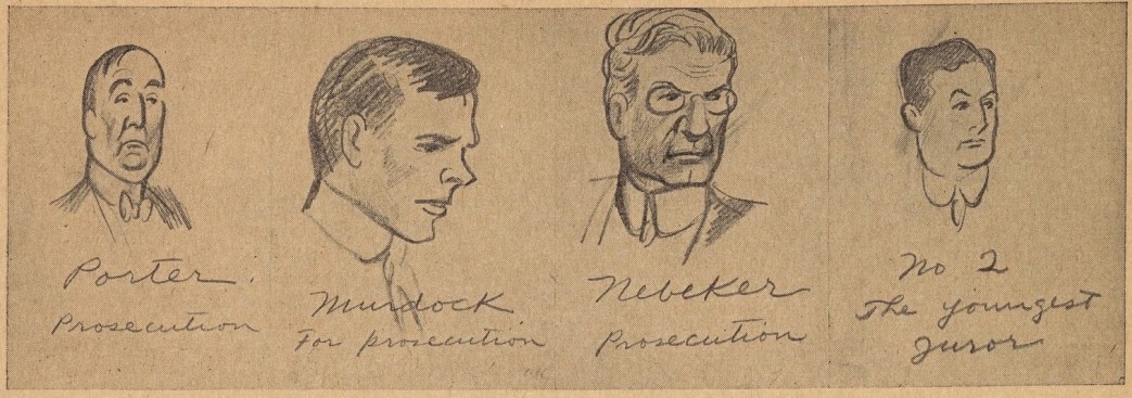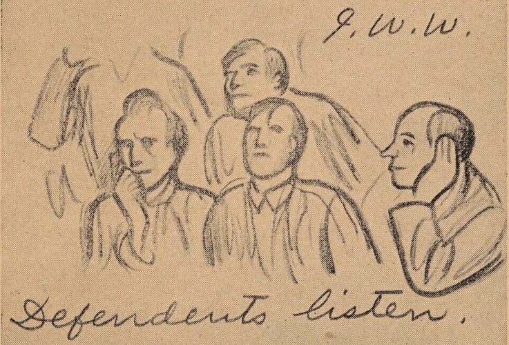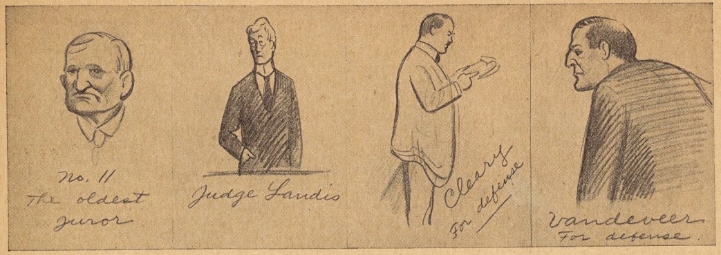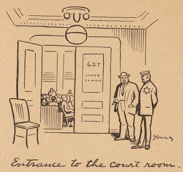 In many ways a most unusual trial. When the judge enters the court-room after recess no one rises- he himself has abolished the pompous formality. He sits without robes, in an ordinary business suit, and often leaves the bench to come down and perch on the step of the jury box. By his personal order, spittoons are placed beside the prisoners’ seats, so they can while away the long day with a chaw; and as for the prisoners themselves, they are permitted to take off their coats, move around, read newspapers.