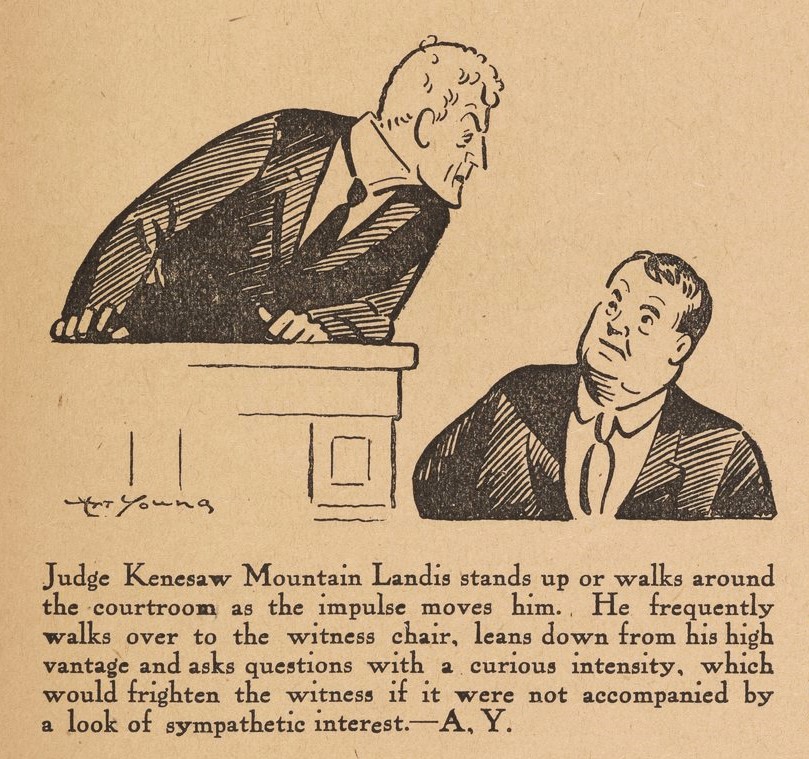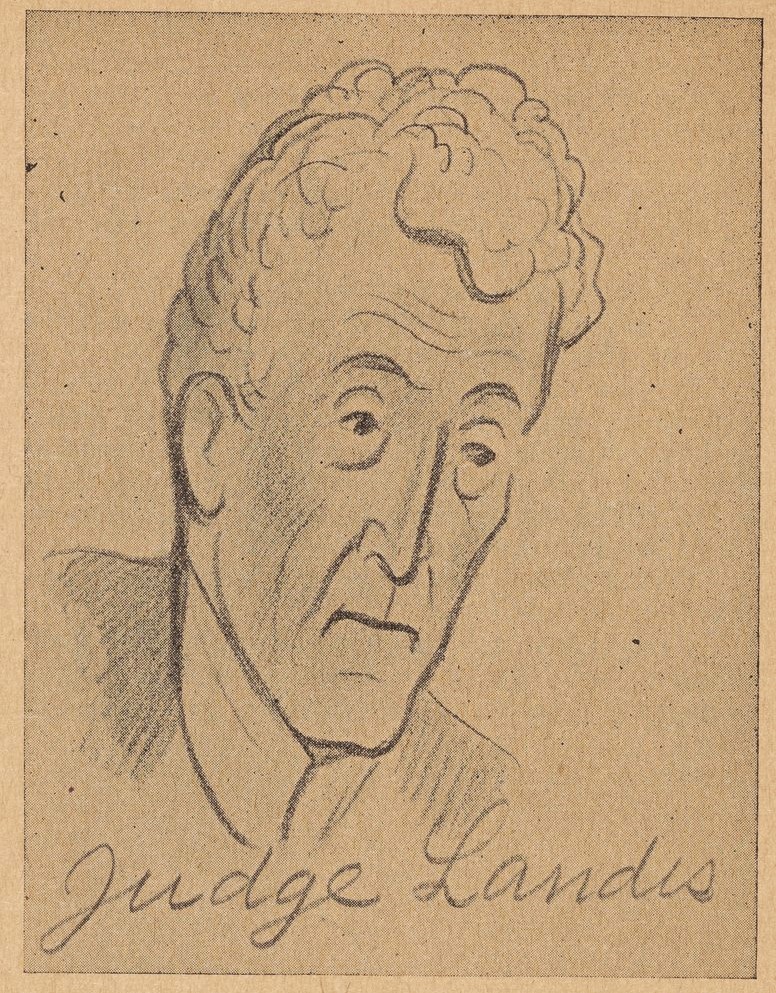 Small on the huge bench sits a wasted man with untidy white hair, an emaciated face in which two burning eyes are set like jewels, parchment skin split by a crack for a mouth; the face of Andrew Jackson three years dead. This is Judge Kenesaw Mountain Landis, named for a battle- a fighter and a sport, according to his lights, and as just as he knows thirty-nine million dollars. (No, none of it was paid.)