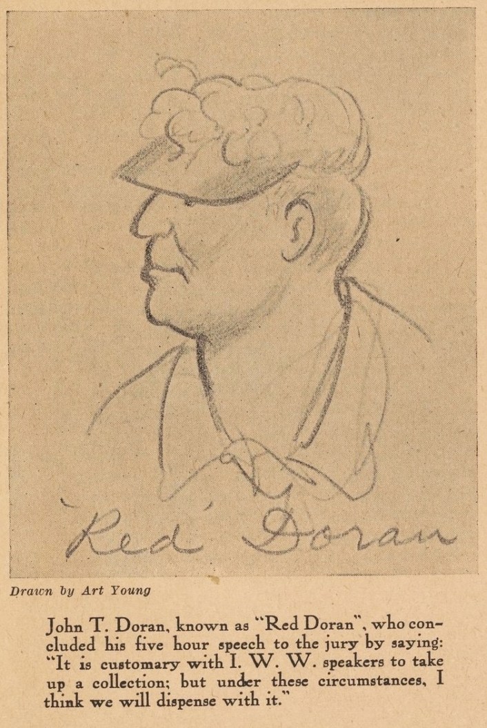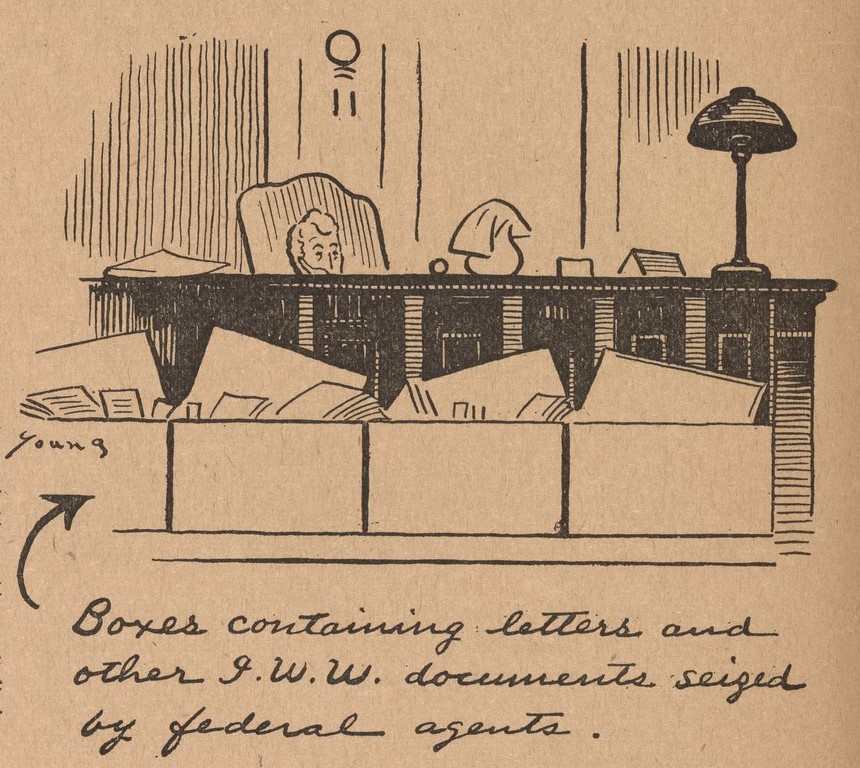It was in September, 1917, that the I.W.W. manhunt began. From that time until April, 1918- seven months- the boys lay in jail, waiting for trial. They were charged with being members of an organization, and conspiring to promote the objects of this organization, which were, briefly, to destroy the wage-system- and not by political action. All this leading inevitably to the “destruction of government in the United States”…This main count in the indictment would have been highly ludicrous if it hadn’t been mixed up with the sinister “obstructing the War Program of the Government”; and there were dragged in the twin sins of Sedition and Opposing the Draft…