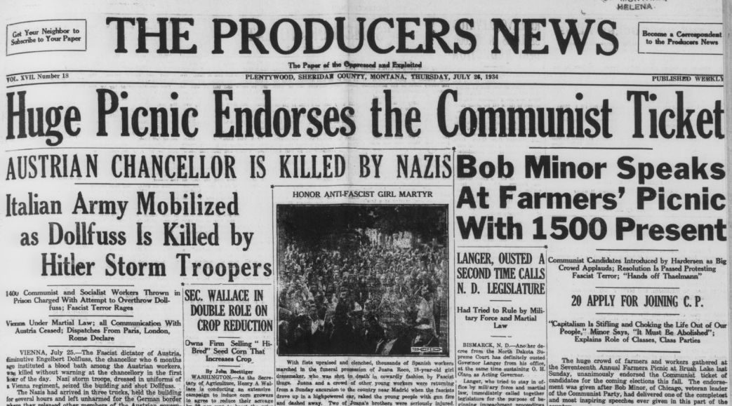 Producer’s News was a radical rural voice that became a Communist publication in the late 1920s. First published in Plentywood, Montana in Sheridan County, one of the few places to elect Communists in the 1920s. as the organ of the Montana Non-Partisan League beginning in 1918, took a left turn and passed into the hands of Communist editor Charley Taylor and then the Montana Farmer-Labor Party in 1924. In the late 1920s the paper became the voice of the United Farmers League before becoming the organ of the Communist-dominated Farm Holiday Association in 1935, ending its nearly twenty year run in 1937.