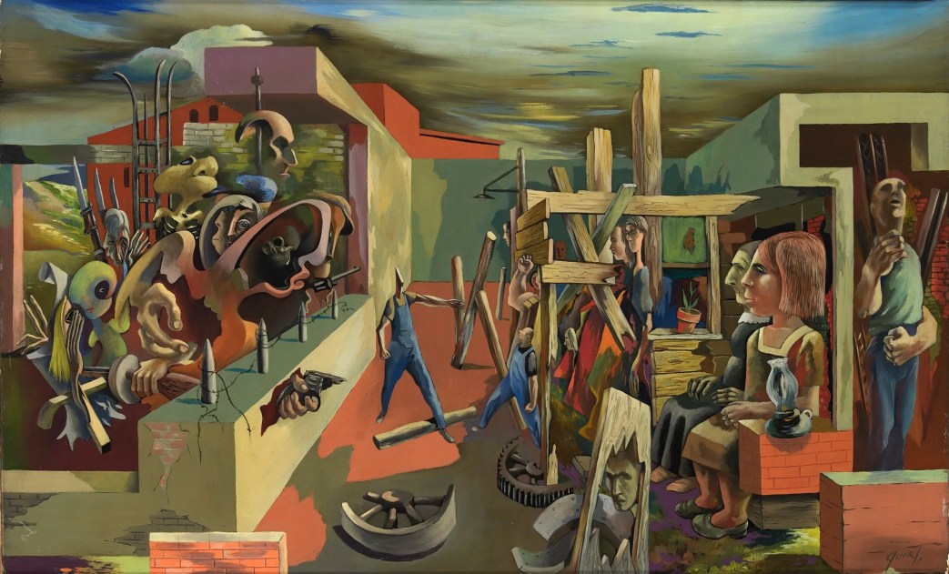 His models seem to be the Florentine painters of the early Renaissance the fourteenth and fifteenth centuries, the moralist painters of German Reformation- Breughel and Hieronymous Bosch. He applies color in their manner and uses their precise linear perspective, whose rules were worked out experimentally at that period. Quirt’s painting is tight, like that of early realistic painting in Florence; it employs classical composition. His is a self-imposed restraint, the better to emphasize his meaning. Actually he rejects the esthetic of classicism by giving a superb satire on it.