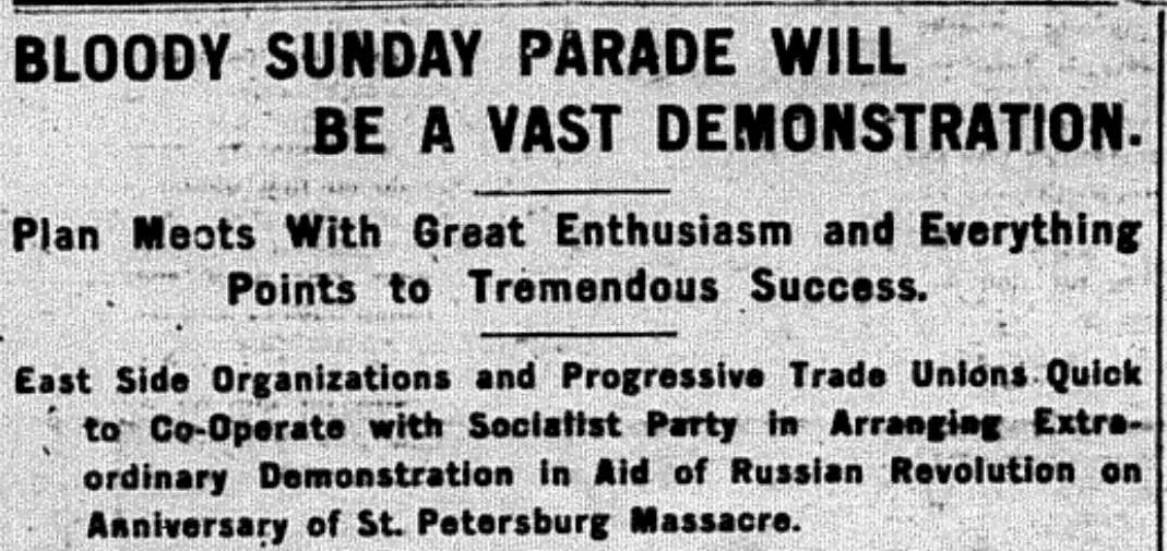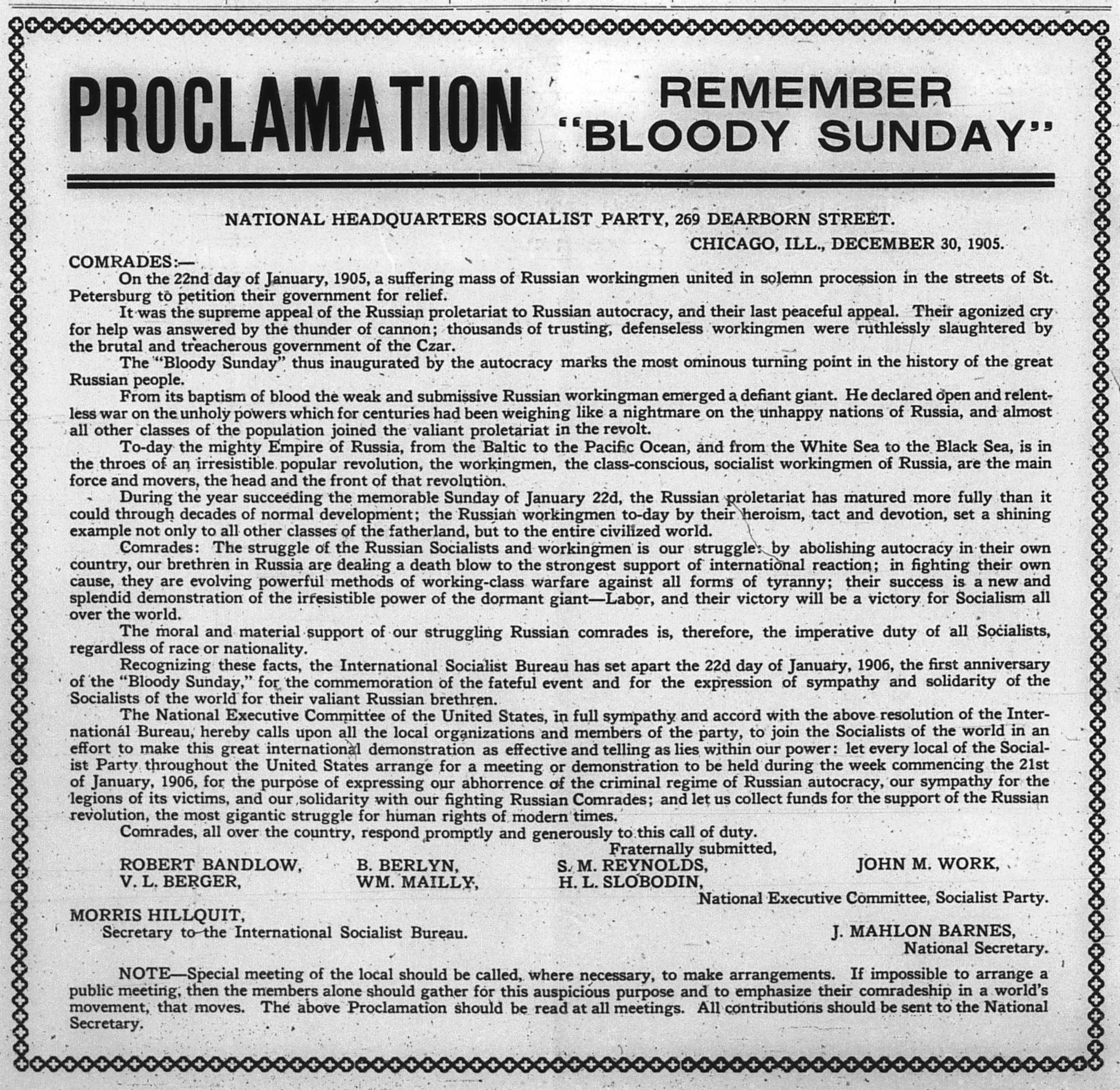“Whereas, On Red Sunday, January 22, 1905, at St. Petersburg, the Czar of Russia caused, without any provocation or justification, the massacre of several thousand defenseless men, women and children of the working class, who, at hundred thousand strong, were peacefully marching to his palace to submit to him a petition praying him, whom they believed to be their Father’, for relief of their conditions, and Whereas, This horrible murder of innocent people did not, as it was intended, terrorize the Russian working people, But only opened their eyes and made them realize, that their supposed ‘Father’ was the chief of the class of Russian capitalists and aristocrats that is oppressing and robbing the people, and that they can only secure their rights and the wealth that they produce, by completely overthrowing the rule of the Czar and his class of oppressors; by securing the supremacy of the working class and establishing a Republic based on the fundamental principles of Socialism, i.e., collective ownership and use by the people of the land, factories and all other means of production and distribution; and Whereas, Ever since Red Sunday the Russian working people, enthused by the lofty ideals of International Revolutionary Socialism and conscious of the great and vital service they are rendering to the cause of emancipation of their class in Russia as well as in all other countries, have been rallying under the international banner of Socialism and, striking as a class in different cities, have been and are still sacrificing their very lives for the cause of working class emancipation; and Whereas, The struggle for freedom of our fellow workmen of Russia directly concerns the workmen of this and all other countries, the struggle between the working class and capitalist class being of international scope and character; therefore, be it