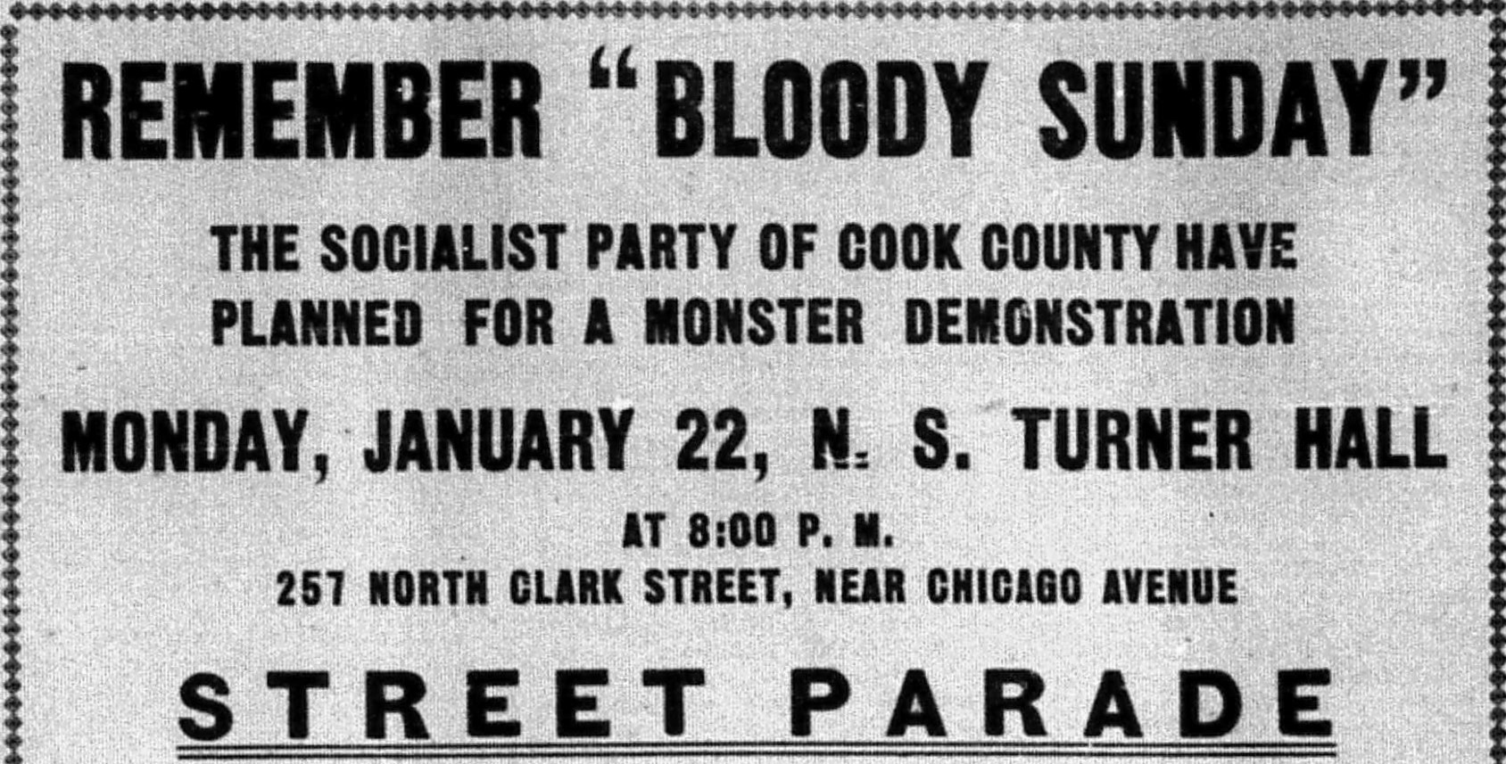 Chicago, Ill., Jan. 22.-The Industrial, Workers of the World commemorated “Red Sunday” at Aurora Hall, and despite the underhand machinations practised by certain “Socialist” party members, met with fair success. A. M. Simons, Chas. O. Sherman, Gen. President of the I.W.W. and Wm. E. Trautmann Gen. Secretary-Treasurer were the speakers. Simons made a statement to the effect that the Russian people did not need literature but powder and guns. Sherman showed him his mistake by saying that the Russian workers need education in order to know how to use the gun. “A collection of $21.50 was taken up. It will be sent to the International Socialist Bureau at Brussels, Belgium. The meeting adjourned with three cheers for the social revolution. The Socialist Party claims to have had 2,000 people at its indoor “Red Sunday” demonstration and about 4,000 in the parade. A collection amounting to $130 was taken up.