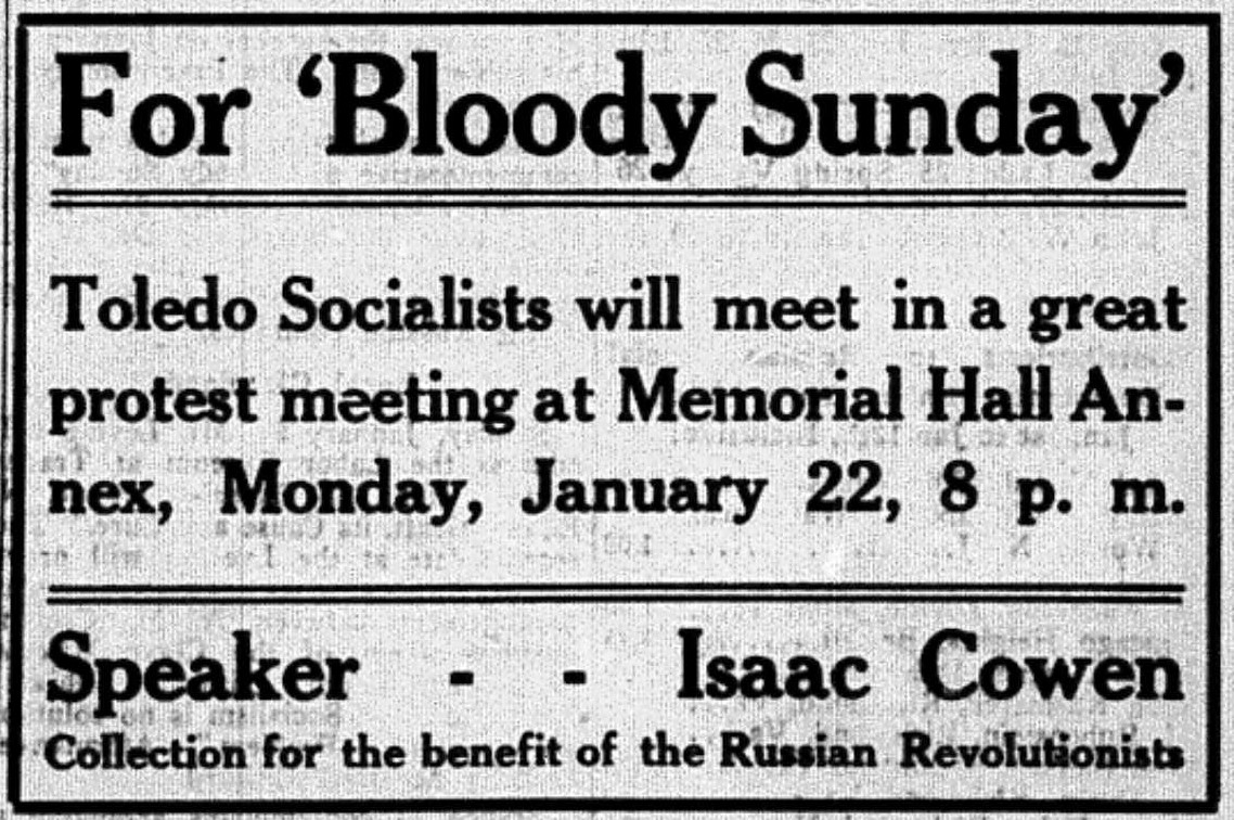 Cleveland, O., Jan. 30.-The first anniversary of Red Sunday was fittingly commemorated in Cleveland at a mass meeting held at Germania Hall, Monday evening, January 22. Despite the fact that the meeting was held on Monday and the weather unfavorable the hall was fairly well filled, the speakers being enthusiastically received. The audience responded nobly to the call for funds to help out the Russian revolutionists, over fifty dollars being collected. The arrangements for the meeting were made by some ten or more organizations that had sent delegates to meet those of the Industrial Workers. The district council of the I.W.W. issued a circular a week or so before Red Sunday calling the attention of the working class to the international character of the labor movement, and to the necessity of Cleveland toilers considering the fight which the working classes of Russia are waging against the Tsar and autocracy, the night of the workers of all countries. Most important of all, the district council asked the different organizations receiving the circular to send delegates to a conference, this conference to make arrangements for a demonstration along the lines suggested by the International Socialist Bureau at Brussels.