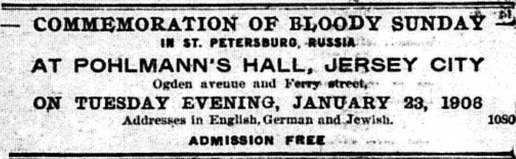 “Resolved, That we, the working men and women of Buffalo, in mass-meeting in Lyceum Theatre assembled, hereby express our horror at the cold blooded murders and wholesale massacres committed by the Russian Czar and his cut- throats on Red Sunday and ever since; and Resolved, That we express our admiration for and send our heartiest encouragement to the working class and all other true and self-sacrificing revolutionists of Russia; and Resolved, That we, recognizing the urgent need by our Russian brothers not only of moral but of financial assistance to enable them to properly equip themselves for further struggle against the combined forces of autocracy, aristocracy and capitalism, hereby appeal to all working people of Buffalo and all other friends of the Russian Revolution to assist them by contributing a day’s wage or whatever other amount they wish to by sending it to the treasurer of the Buffalo committee, Mr. Henry Bangert, 106 Cedar street, Buffalo, N. Y., and finally Resolved, That we appeal to the working people of Buffalo to recognize, before a Red Sunday–a massacre of workmen on a large scale–is enacted on American soil: