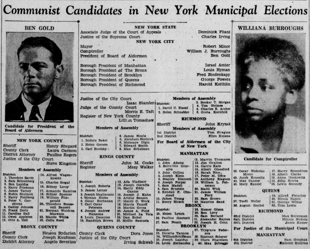 WILLIANA J. BURROUGHS isn’t running for Comptroller on the Communist ticket to catch the “women’s vote.” She is running for that office because, in common with the other leading candidates of the Party, she has proved that she has the attributes of Communist leadership–an understanding of Communist theory, an understanding of the local issues involved in the election, and the willingness and ability to work unsparingly to put into effect the local Communist Party program should she be elected.