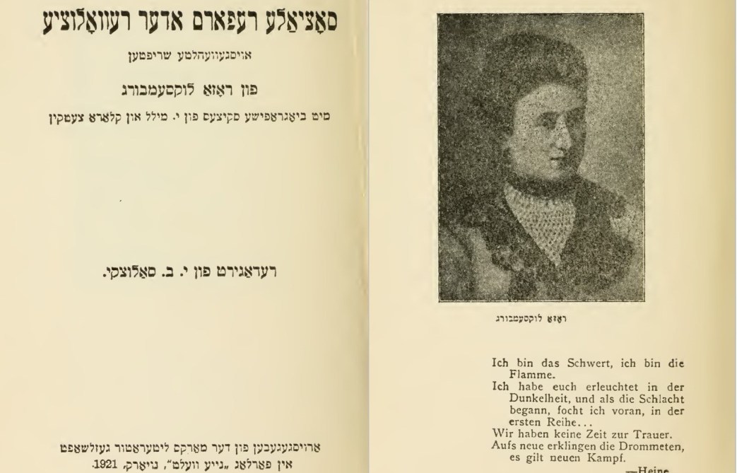 A unique collection of Rosa Luxemburg’s writings published in Yiddish by Benjamin Salutsky (J. B. S. Hardman) who in 1921 was a leading member of the dissident Communist Workers Council group. He had been secretary of the Jewish Socialist Federation (JSF) and editor of the Federation’s weekly, Di Naye Welt (The New World). A labor leader in the New York area, he was long an official with the Amalgamated Clothing Workers of America. He would later join the CP only to be expelled, then went on to become a leader of the Brookwood Labor College and the Conference for Progressive Labor Action. He left the CPLA when it joined the Communist League of America (Trotskyists) to form the Workers Party of the United States. He eventually left radical politics to become a social democratic labor leader.