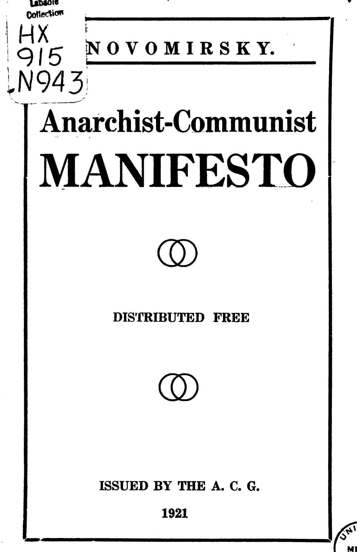 The Anarchist-Communist Manifesto by Daniil Novomirsky. Published by the Anarchist Communist Group, New York. 1921.