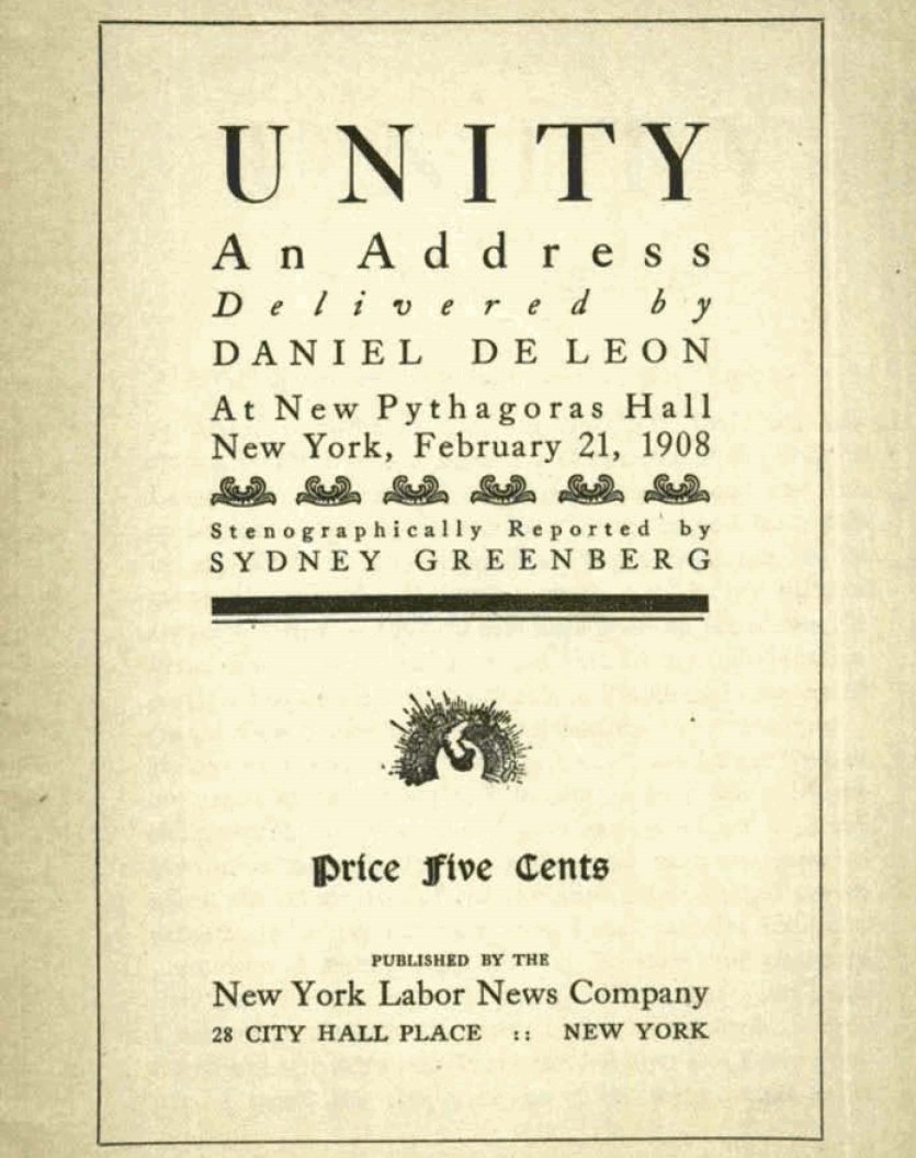 PDF of full pamphlet: http://palmm.digital.flvc.org/islandora/object/ucf%3A4955/datastream/OBJ/download/Unity__An_address_delivered_by_Daniel_De_Leon_at_New_Pythagoras_Hall__New_York__February_21__1908.pdf