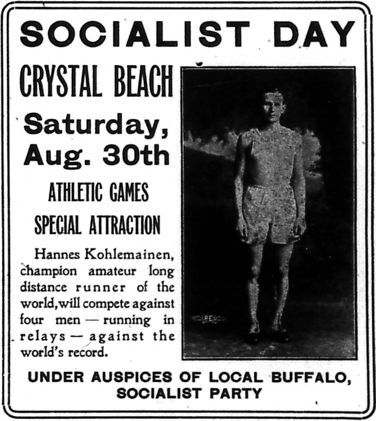 There will be all kinds of doings. For the first time in the history of the Socialist Party of this city athletic games will be held under our auspices. How we have grown! The chief attraction at the games will be Hannes Koblemainen, champion runner of the world. He will run against four men to beat the world’s record and Hannes is the boy to do it.