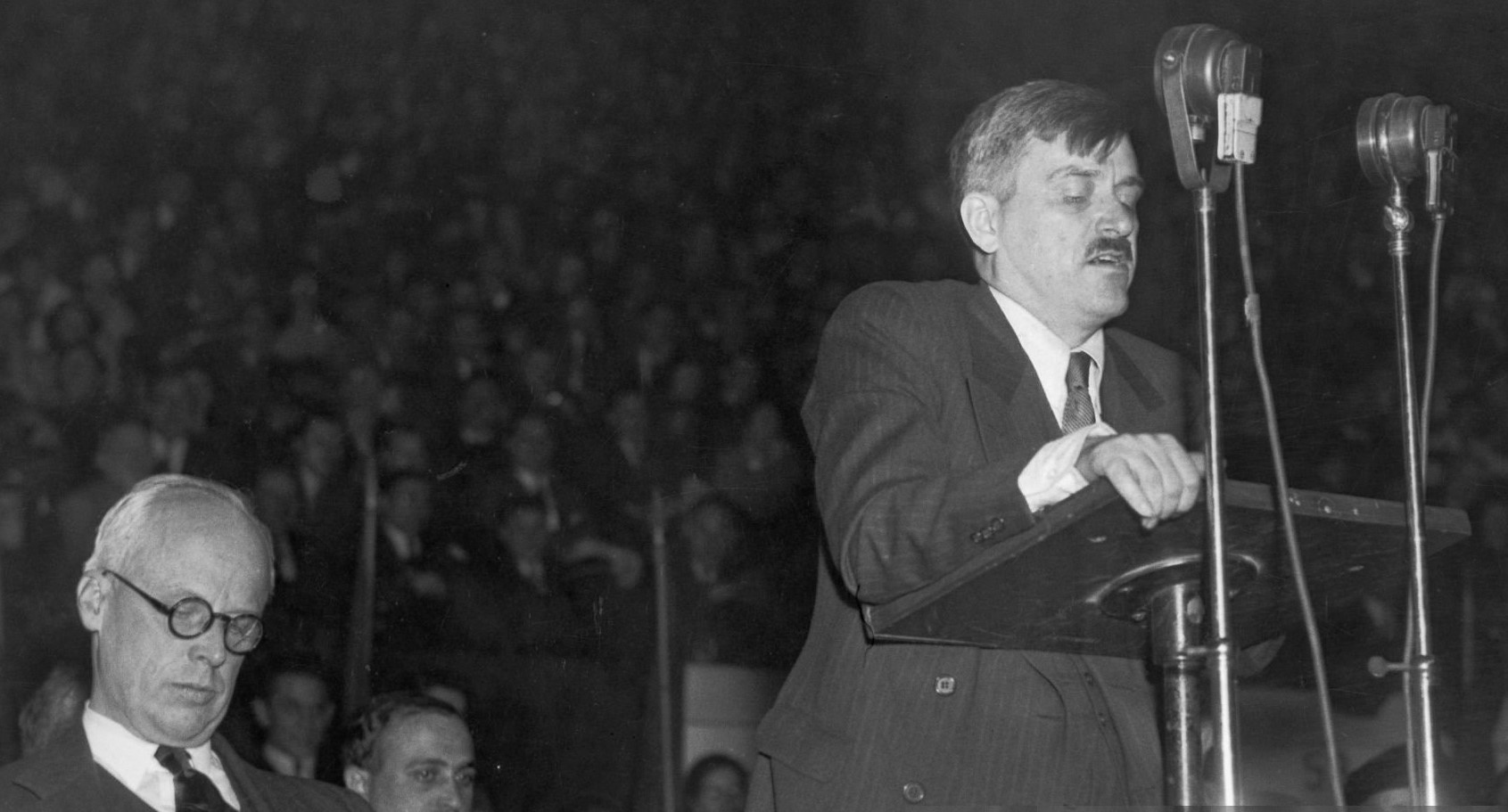 Earl Browder, General-Secretary of the Communist Party promotes defends the new ‘Popular Front’ orientation in the United States. Formally enacted by the Seventh, and last, Congress of the Communist International in 1935, the ‘Popular Front’ remained official policy until the ‘Treaty of Non-Aggression between Germany and the Union of Soviet Socialist Republics’ of August, 1939. Interestingly, as the C.P. began facing the Socialist Party, the S.P. left, rejecting a Popular Front, became ascendant.