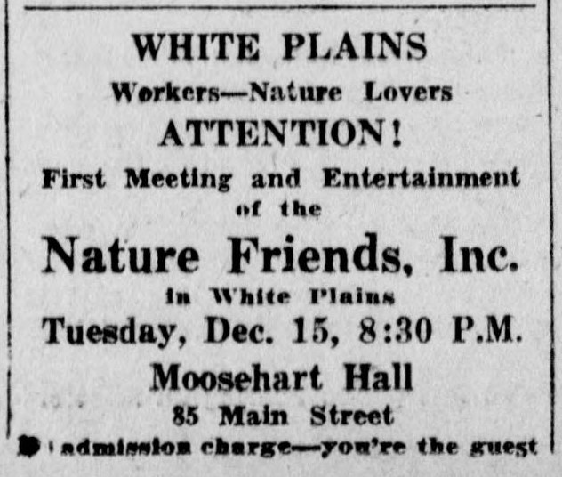 Nature Friends Branches: New York City, N.Y., Rochester, N.Y., Syracuse, N.Y., Bridgeport, Conn., Stamford, Conn., Jersey City, N.J., Newark, N.J., Passaic, N.J., Paterson, N.J., Allentown, Pa., Philadelphia, Pa., Chicago, Ill., Milwaukee, Wisc., Los Angeles, Calif., Oakland, Calif., San Francisco, Calif., Salt Lake City, Utah. For further information write to the Nature Friends, 11 West 18th Street, New York City.