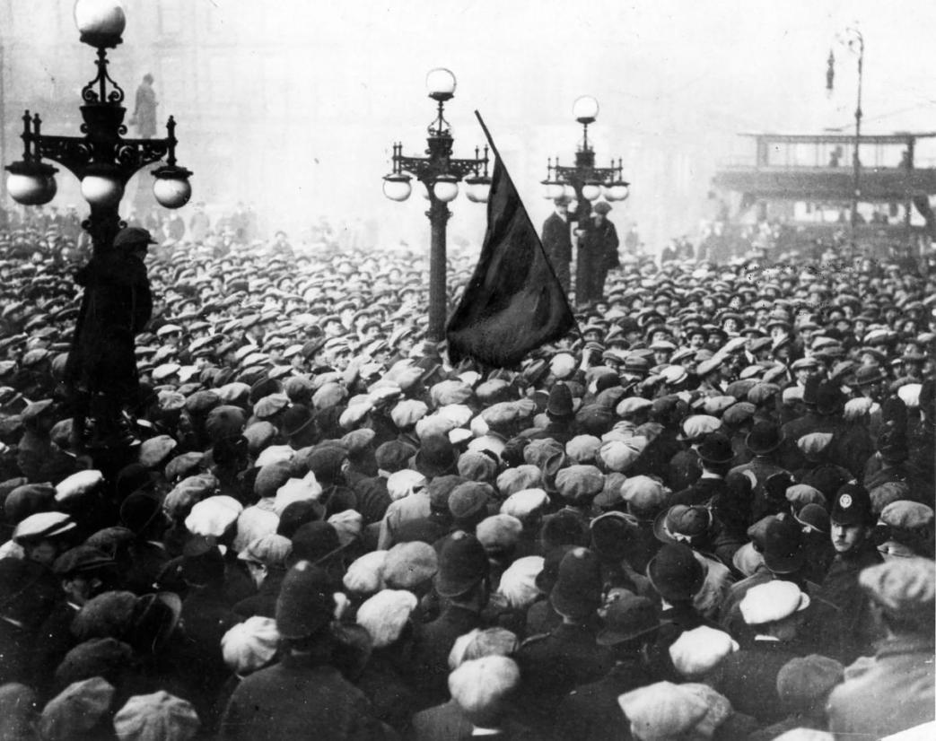 Well, during the war, of course Glasgow became one of the greatest munition-making centers in the Empire. Yes, the Clyde made munitions and sent thousands of kilted bare-kneed lads to the front, but the Clyde never gave its heart to the war. From the great Keir Hardie Memorial meeting in 1915 when Robert Smillie said, “Fellow workers, this war which has killed Keir Hardie is a capitalist war,” to the day of the armistice, there wasn’t an hour when it wasn’t safer to hold a peace meeting than a war meeting in Glasgow. Night after night John Maclean and James MacDougal held their peace meetings right opposite the recruiting office. The crowd grew and they were unmolested. In 1917 Helen Crawfurd of the Women’s International League conducted an out-and-out peace crusade, with processions, banners, street meetings and all, after the fashion of suffrage days, and no one dared interfere with her. In fact there were 4,000 shop-stewards organized to protect peace meetings. A certain number of these, each one with 18 inches of lead pipe under his coat, would be detailed to attend whenever trouble was expected. Glasgow was ready for anything.