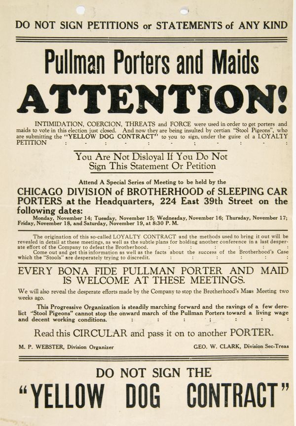 The goal of the Brotherhood of Sleeping Car Porters is to abolish such conditions. Among its demands, in addition to complete recognition of the new organization, are higher wages, shorter hours, better working conditions, pay for overtime, pay for “preparation” time, abolition of “doubling out”,” abolition of tipping system, conductor’s pay for conductor’s work, when in charge, and manhood rights.
